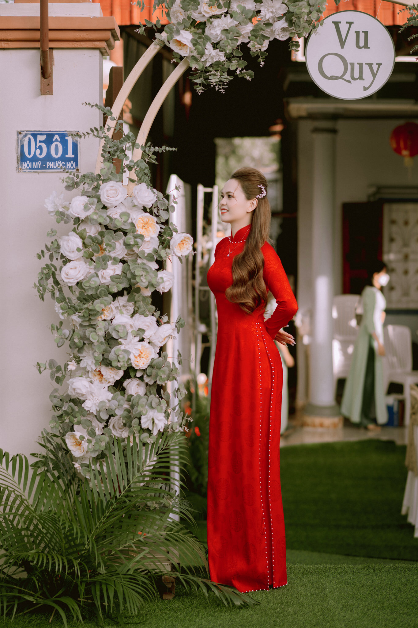 Trong ngày trọng đại, Ngọc Tuyền đã lựa chọn cho mình một thiết kế áo dài cưới màu đỏ rực rỡ, một gam màu tượng trưng cho tình yêu nồng cháy và sự may mắn. Thiết kế truyền thống với cổ trụ cao, tay dài được làm mới bằng những họa tiết hoa văn tinh xảo trên nền vải gấm, tôn vinh trọn vẹn nét đẹp Á Đông, vừa dịu dàng, đằm thắm lại vừa sang trọng, quý phái.