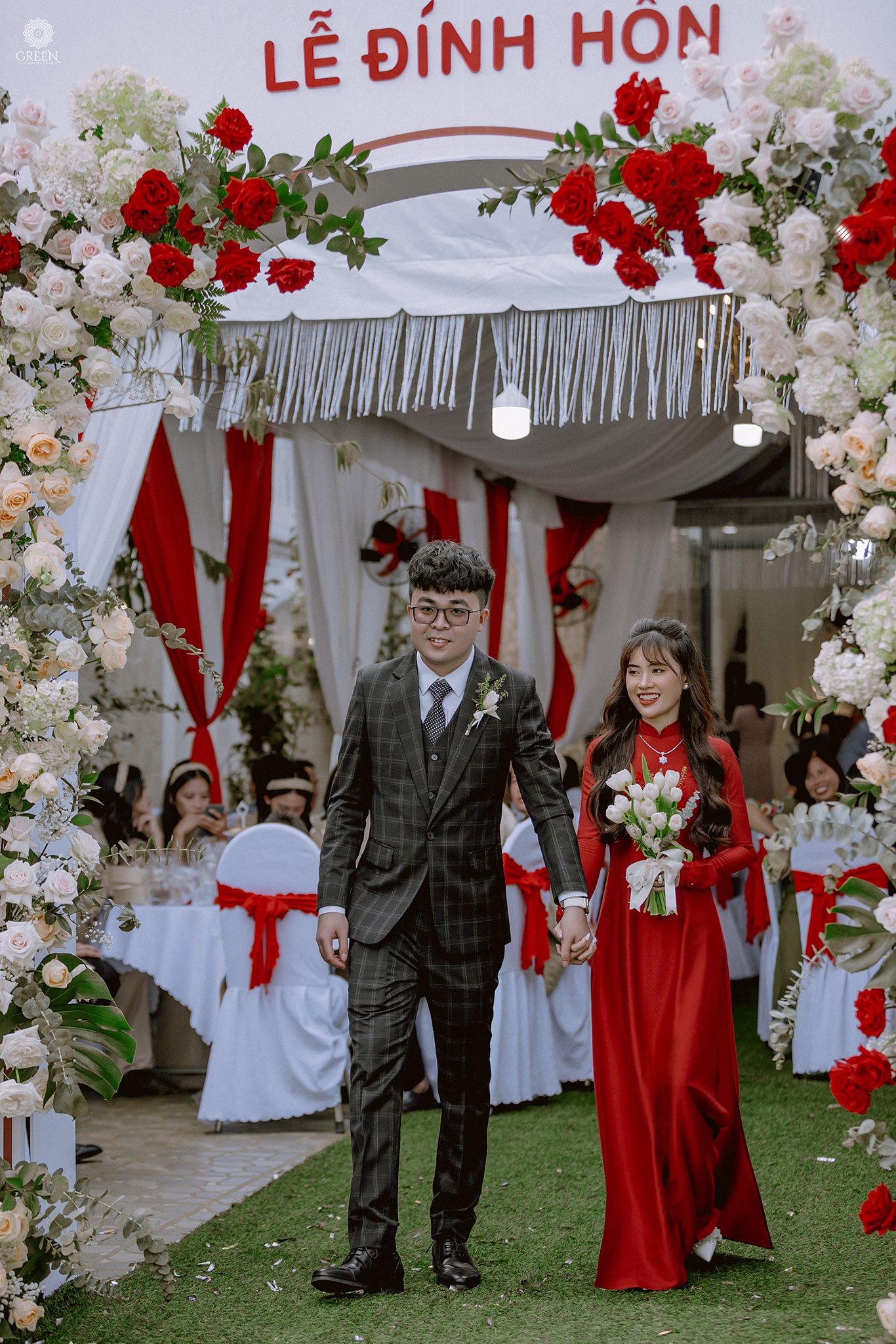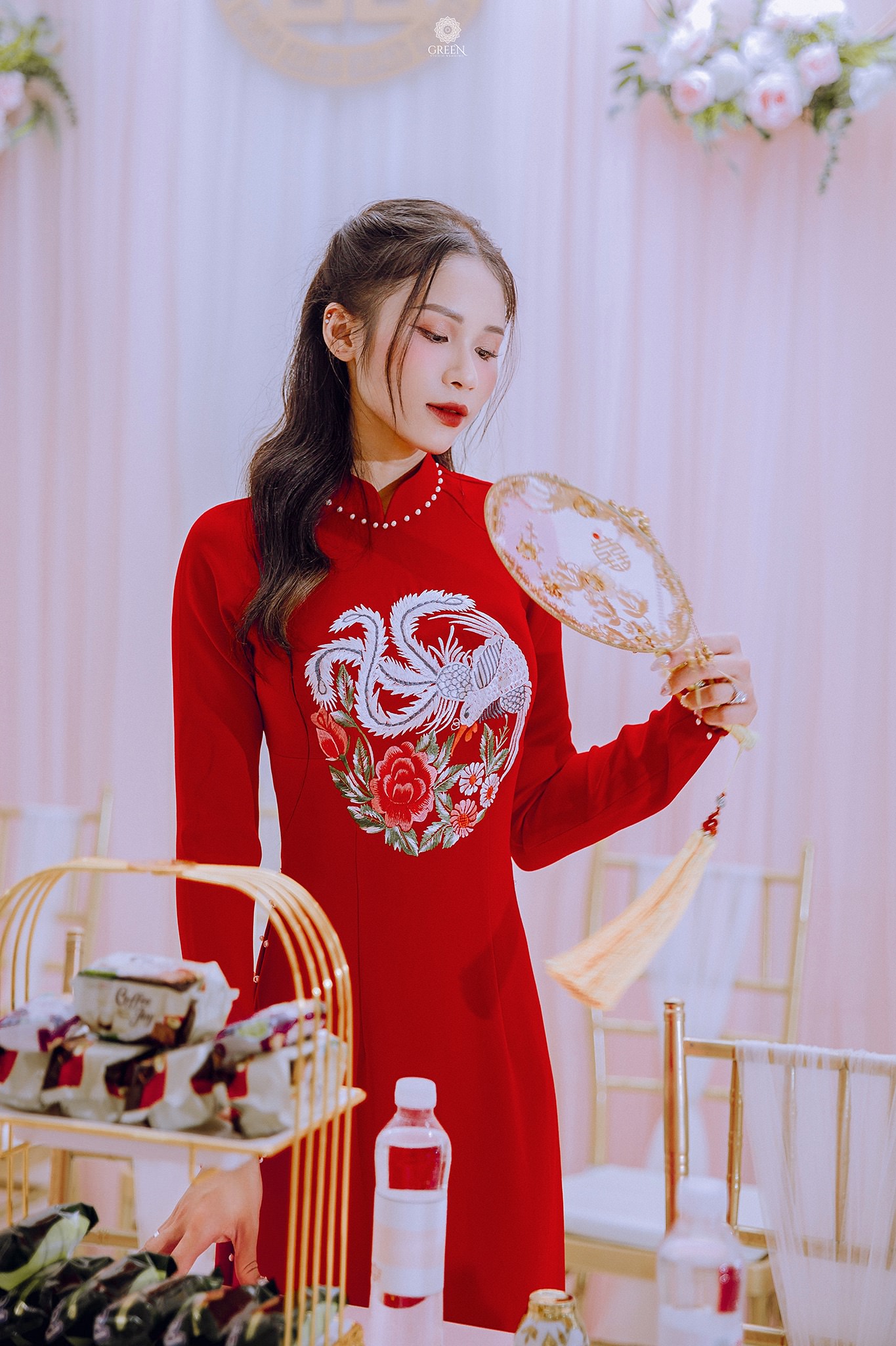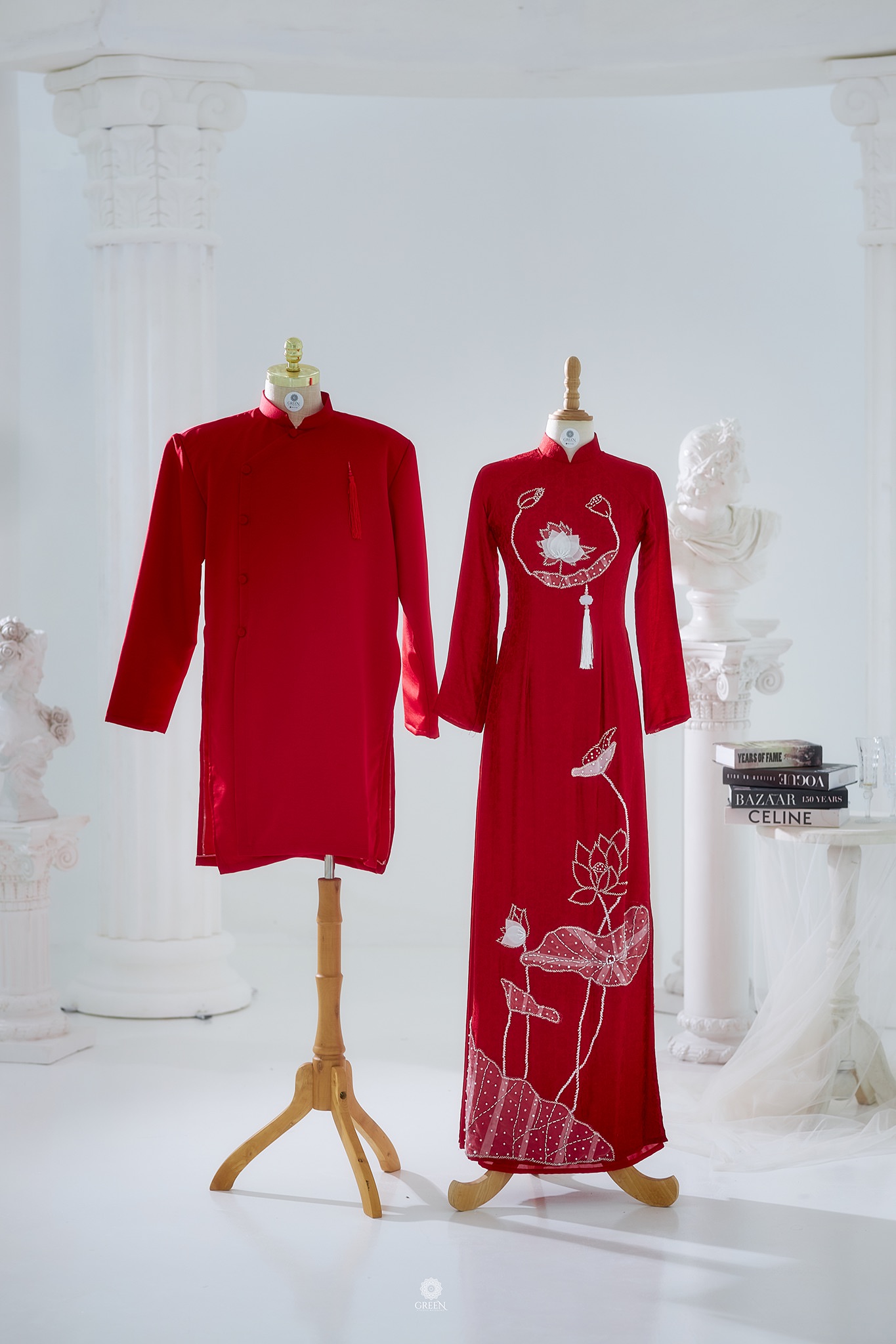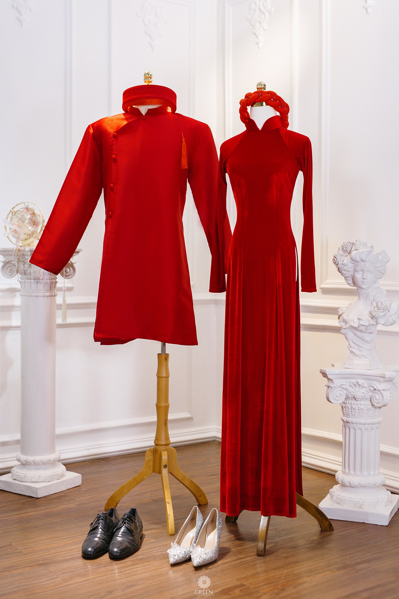 Sắc đỏ nồng nàn tượng trưng cho tình yêu, may mắn và hỷ sự. Những thiết kế áo dài cưới màu đỏ của Green, từ chất liệu gấm, lụa đến nhung cao cấp, sẽ giúp cô dâu trở nên nổi bật và rạng rỡ nhất trong lễ ăn hỏi hoặc khi đi chào bàn. Các thiết kế áo dài cặp cho cô dâu và chú rể cũng được chăm chút để tạo nên sự đồng điệu và gắn kết hoàn hảo.