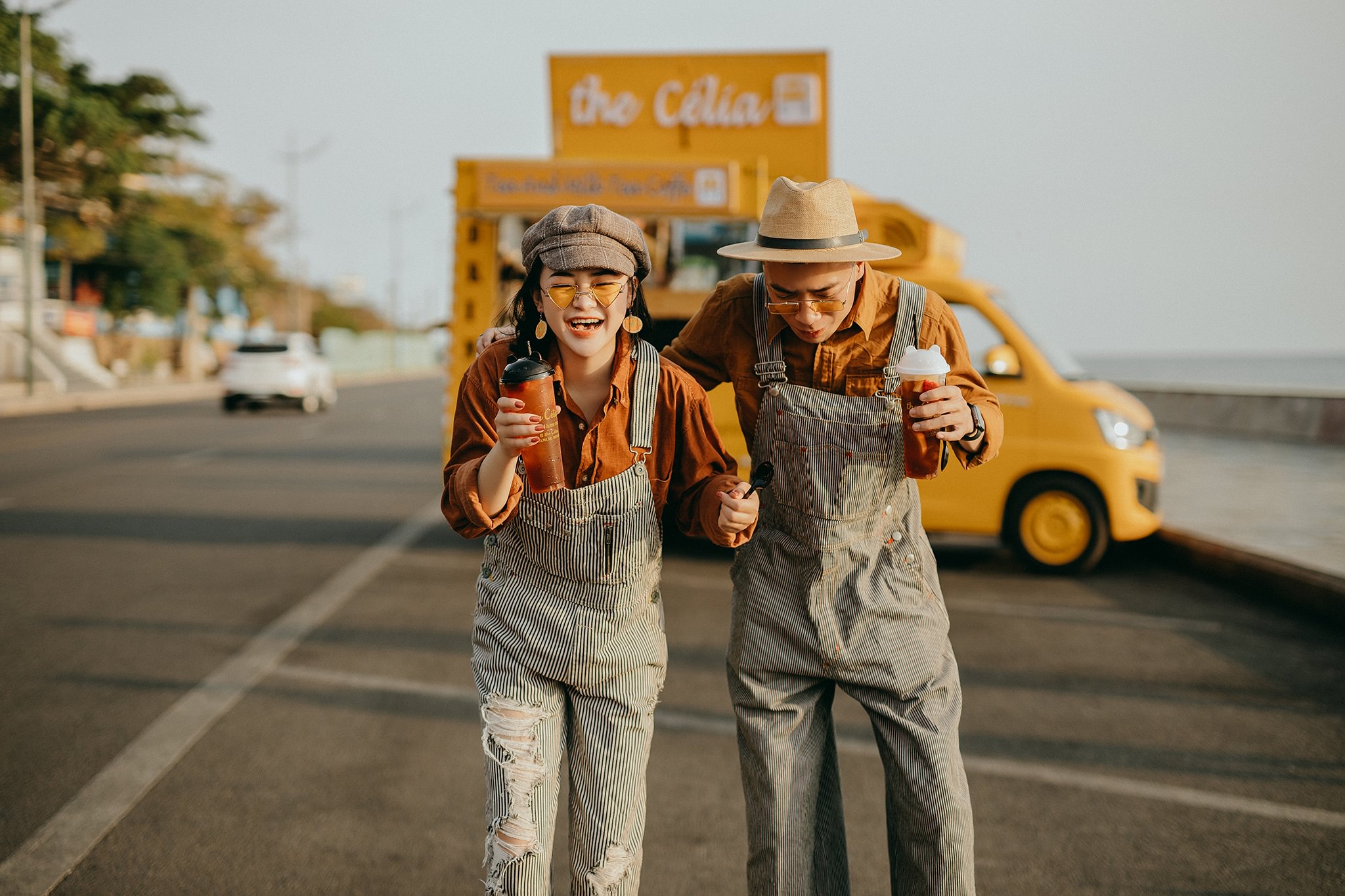 Điểm nhấn đầu tiên và ấn tượng nhất của bộ ảnh chính là sự đồng điệu trong trang phục. Cặp đôi đã cùng nhau lựa chọn một concept đậm chất retro với gam màu nâu cam ấm áp, quần yếm sọc và những phụ kiện tinh tế. Sự “ton-sur-ton” này không chỉ tạo ra một tổng thể hài hòa, nó còn là lời khẳng định về sự hòa hợp trong một album chụp ảnh cưới street style Vũng Tàu đầy cá tính.