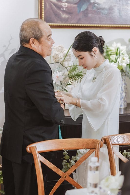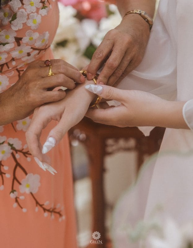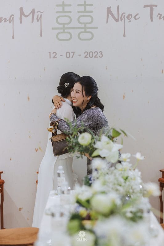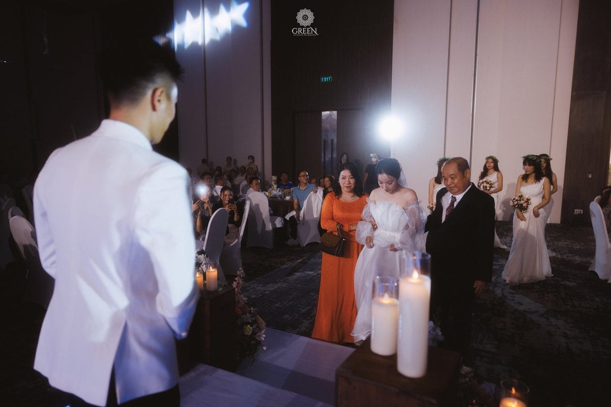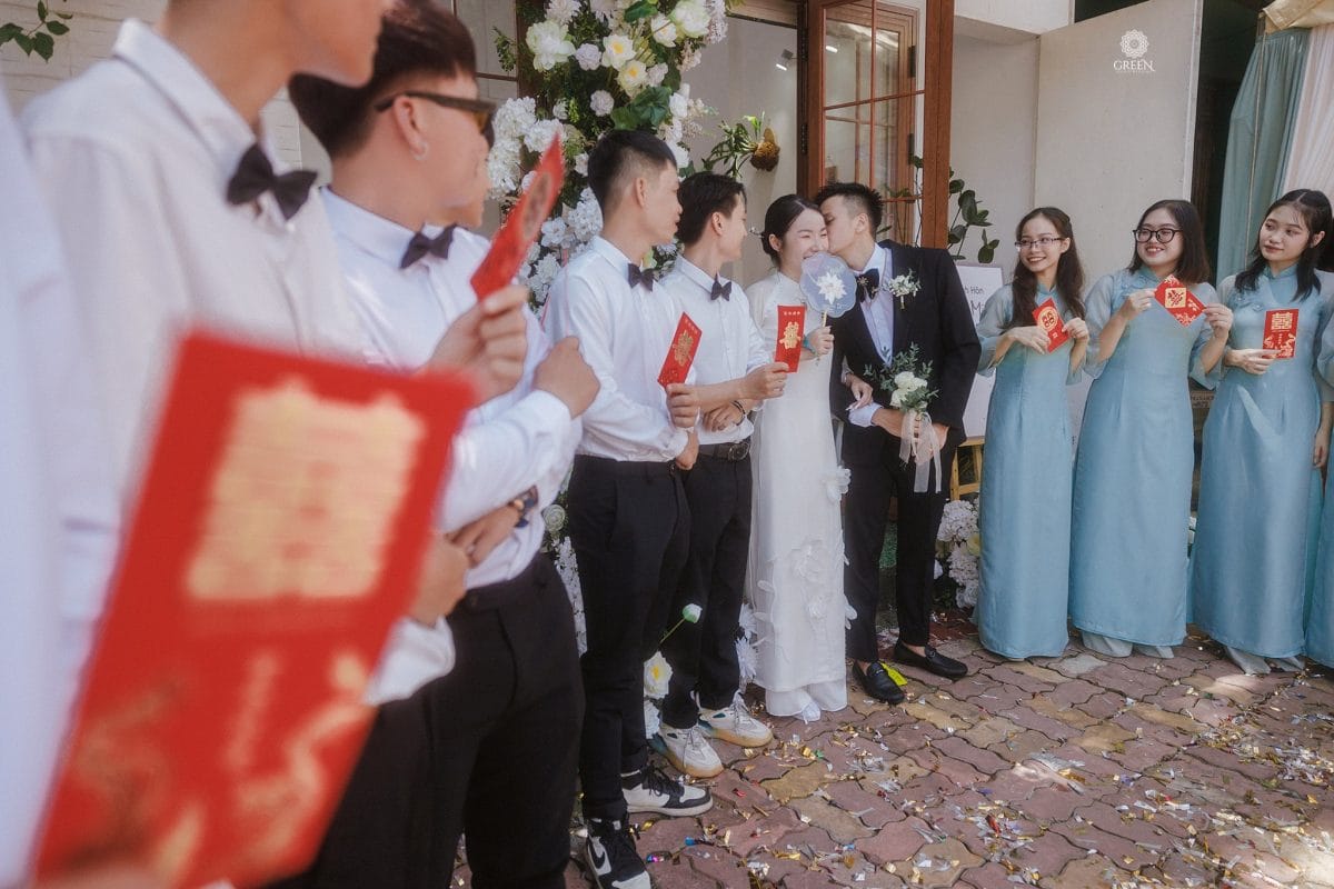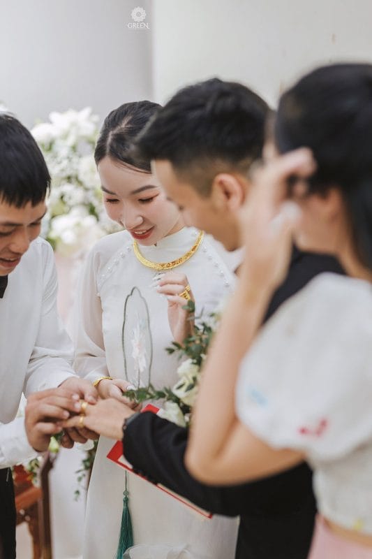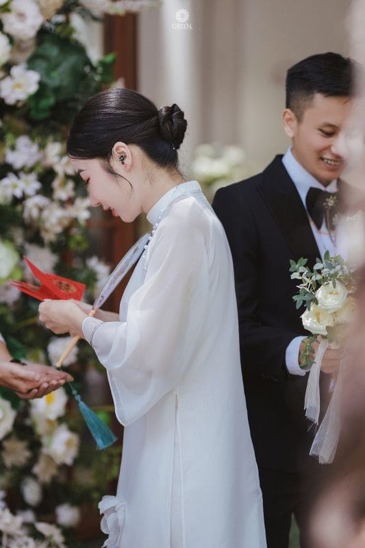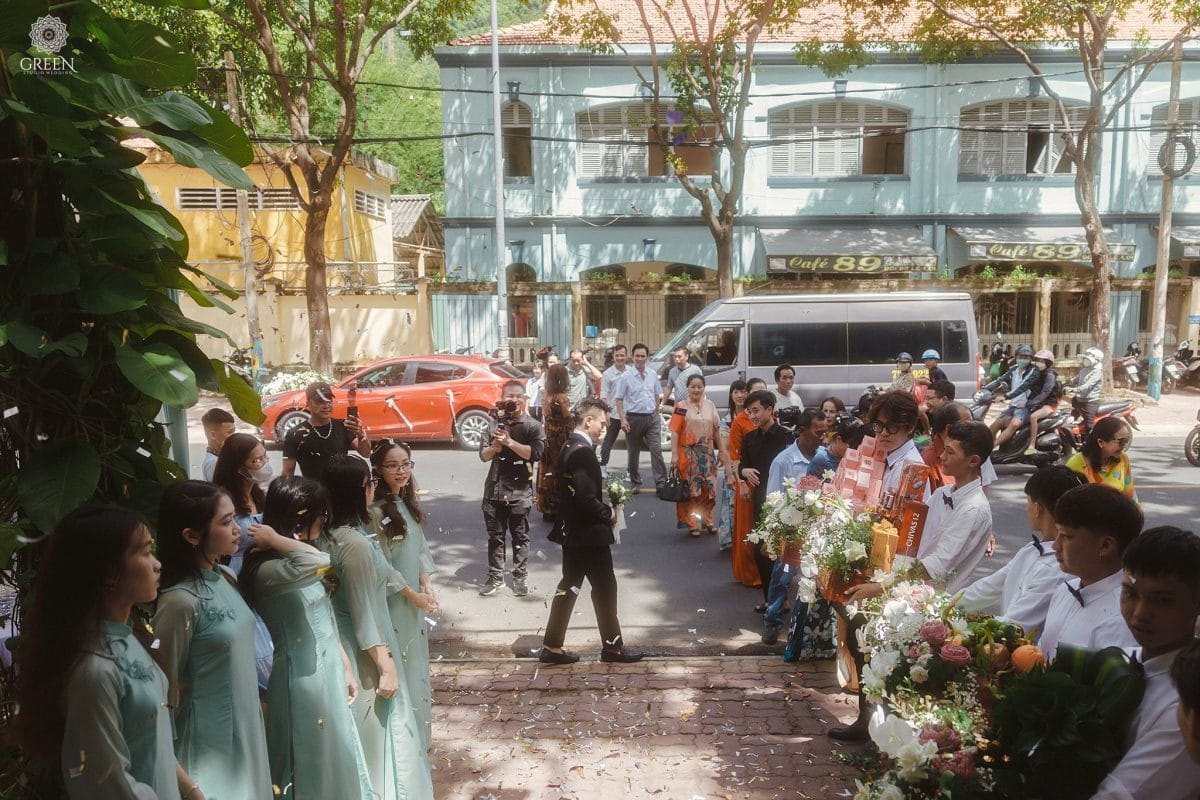 Ngày vui bắt đầu trong không gian trang nghiêm của lễ gia tiên. Tà áo dài truyền thống, mâm quả đỏ thắm, và những lời dặn dò của cha mẹ đã tạo nên những khung hình đầy ý nghĩa. Ống kính của Green Studio lúc này là một người quan sát thầm lặng, bắt trọn ánh mắt tự hào của ba, cái siết tay bịn rịn của mẹ khi Trân chuẩn bị về nhà chồng. Đây là những khoảnh khắc nền tảng, tạo nên chiều sâu cho một bộ phóng sự cưới giàu cảm xúc.