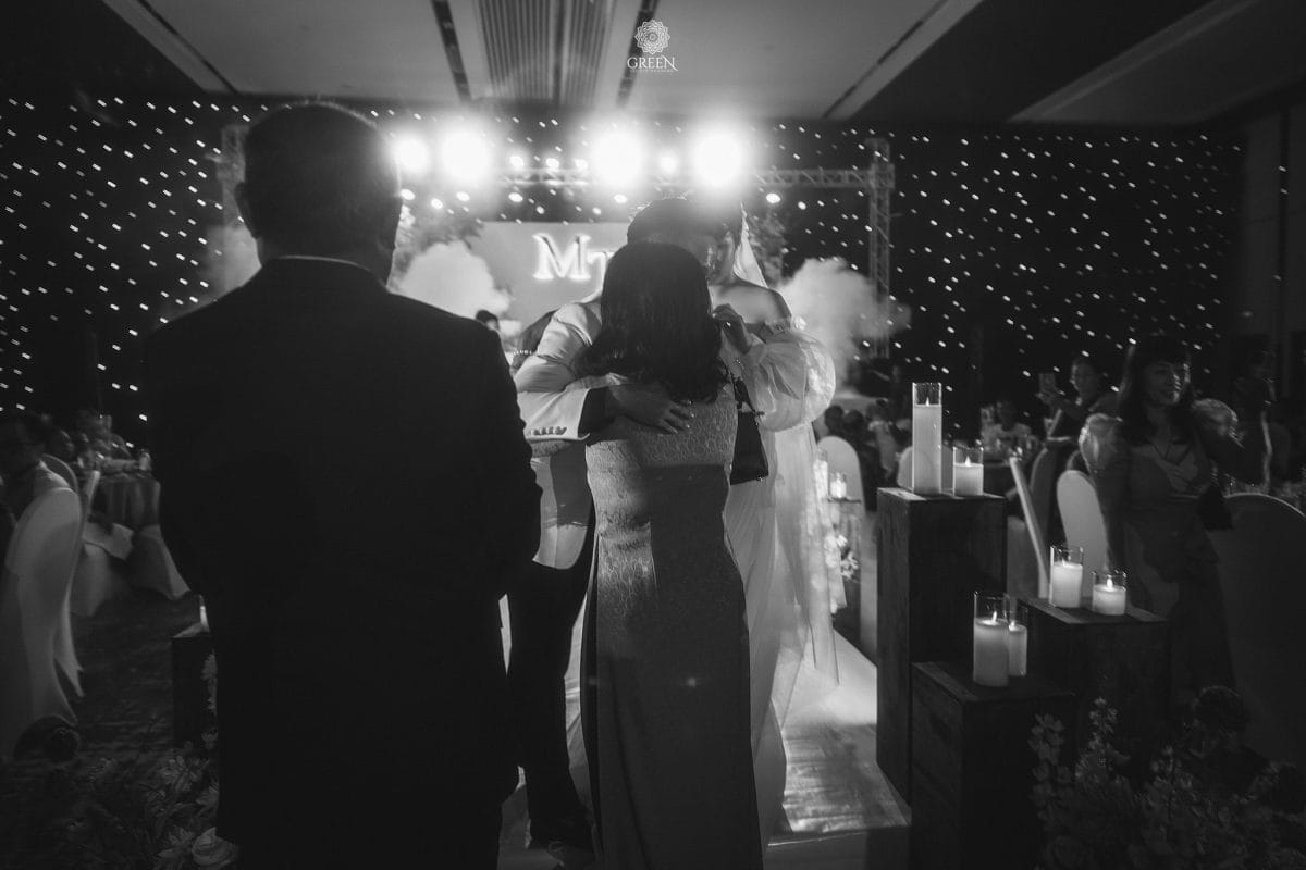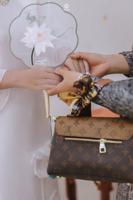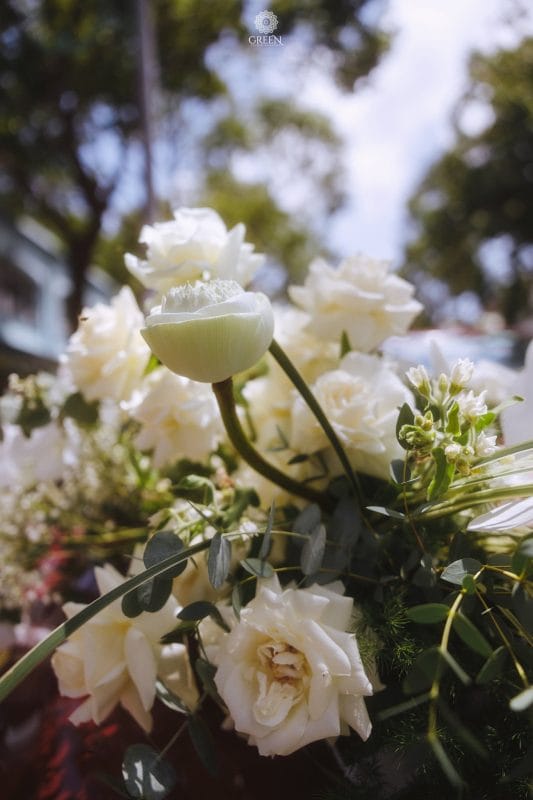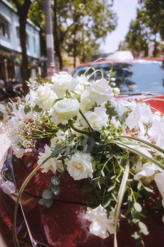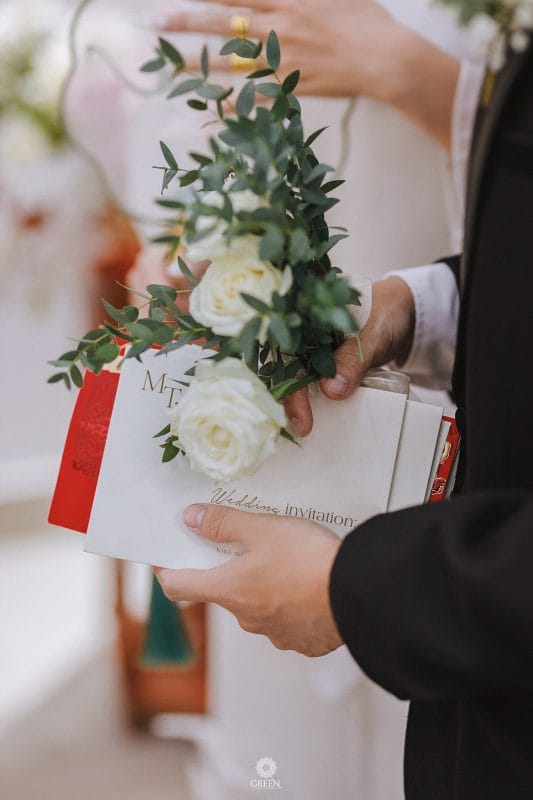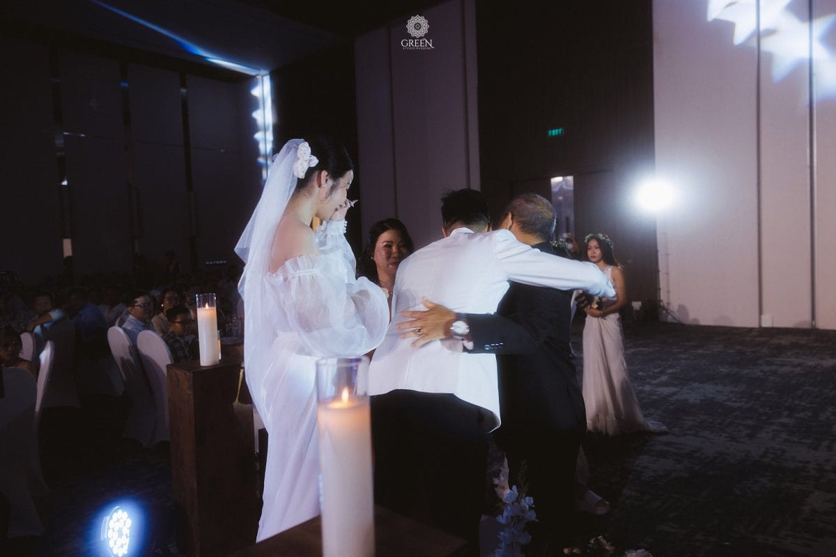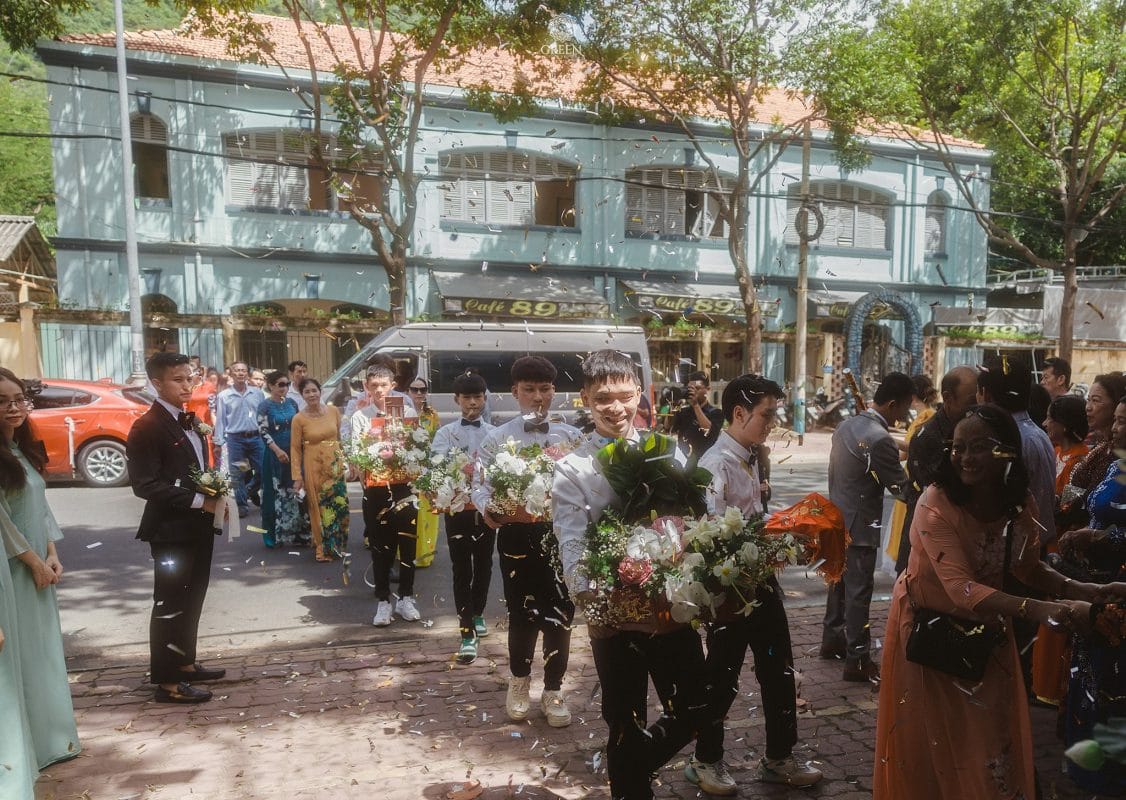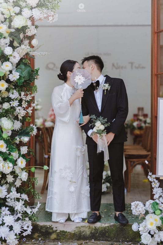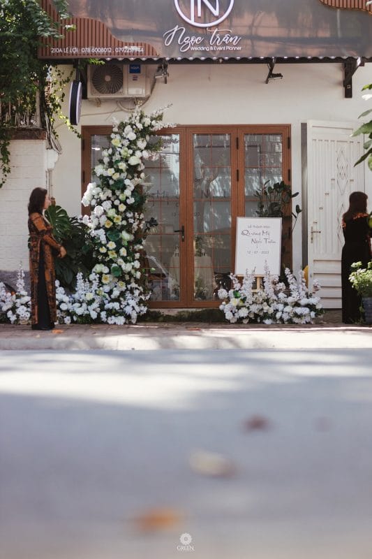 Ngày vui bắt đầu trong không gian trang nghiêm của lễ gia tiên. Tà áo dài truyền thống, mâm quả đỏ thắm, và những lời dặn dò của cha mẹ đã tạo nên những khung hình đầy ý nghĩa. Ống kính của Green Studio lúc này là một người quan sát thầm lặng, bắt trọn ánh mắt tự hào của ba, cái siết tay bịn rịn của mẹ khi Trân chuẩn bị về nhà chồng. Đây là những khoảnh khắc nền tảng, tạo nên chiều sâu cho một bộ phóng sự cưới giàu cảm xúc.