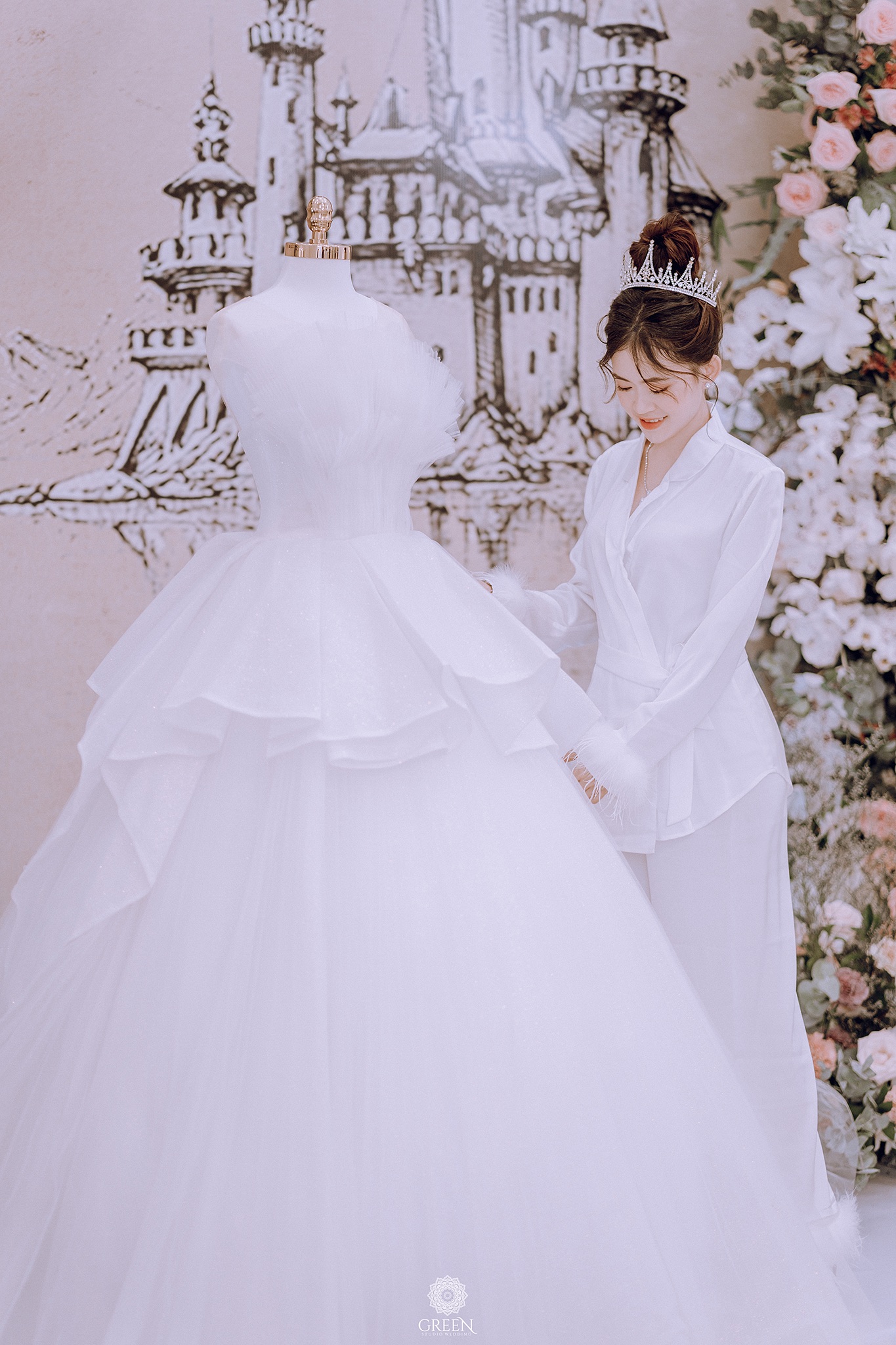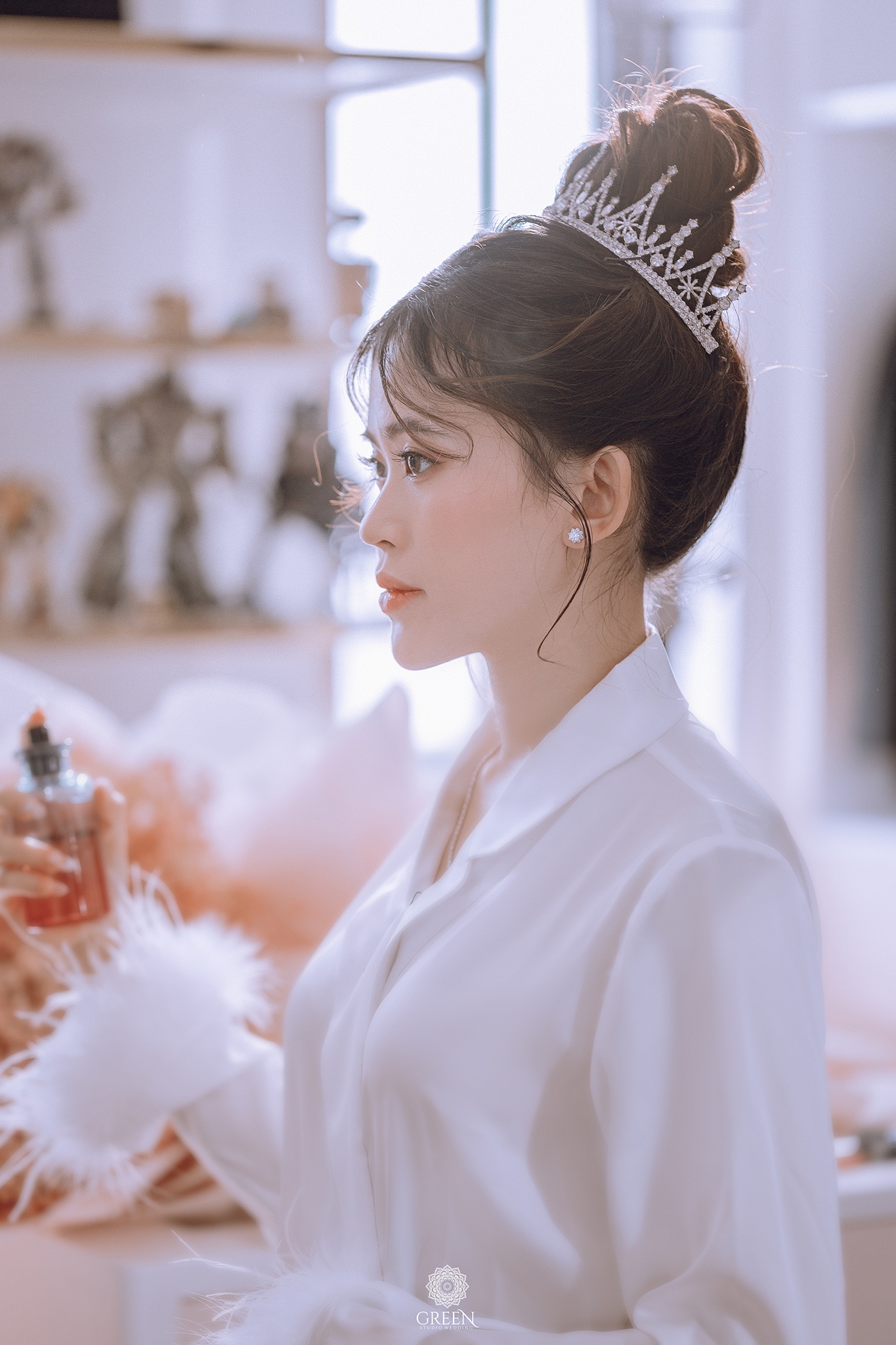 - Mẹo từ Green Studio: Trong lúc cô dâu đang trang điểm, ekip sẽ tranh thủ chụp các chi tiết (detail shots) đắt giá: chiếc váy cưới treo bên cửa sổ, đôi giày, cặp nhẫn, hoa cầm tay, thiệp mời… Đây là những hình ảnh làm tăng thêm chiều sâu cho album phóng sự cưới.
