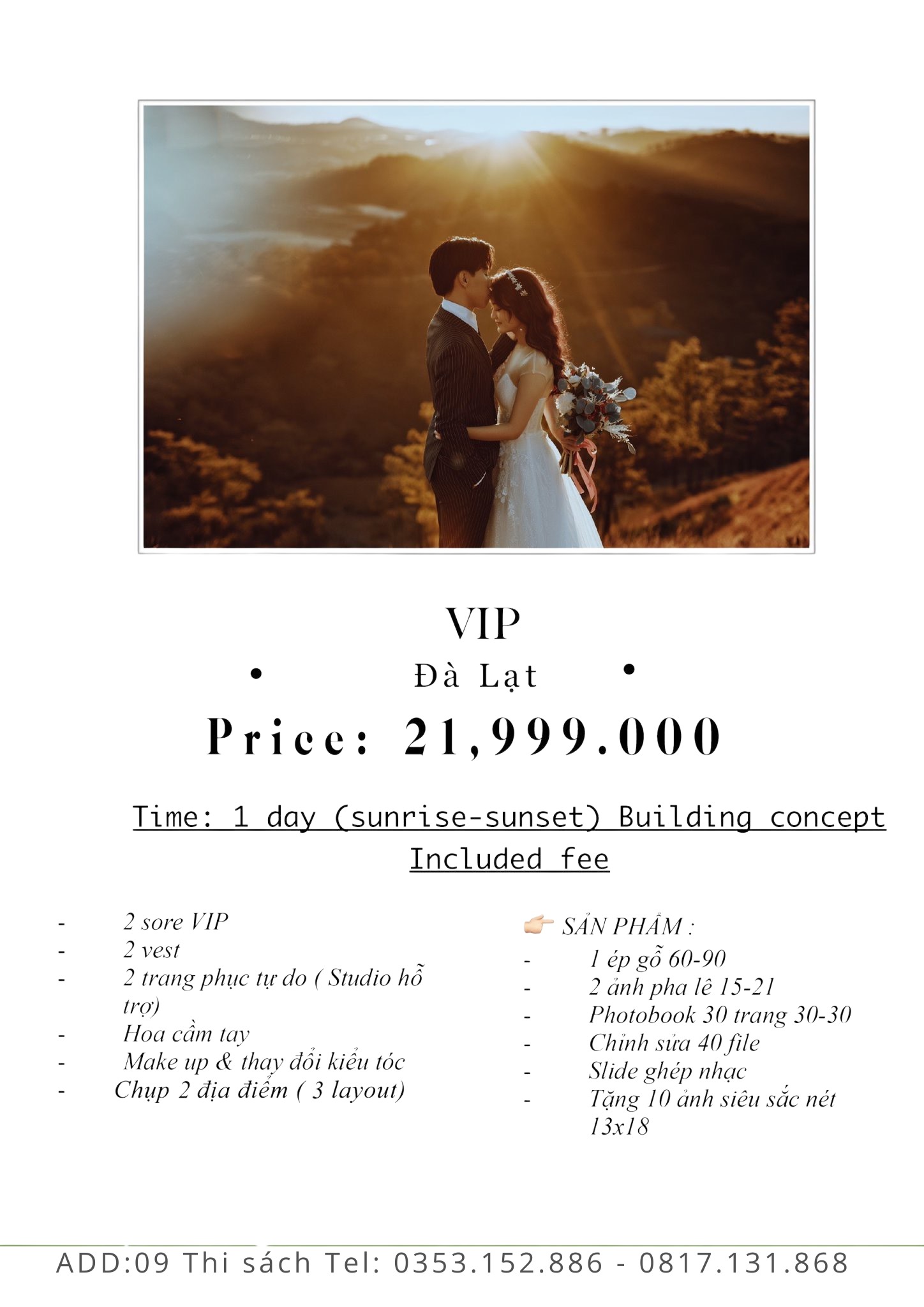 Trọn vẹn một ngày cùng gói chụp ảnh cưới Đà Lạt ‘VIP’ từ bình minh đến hoàng hôn. Gói bao gồm 2 váy VIP, makeup, album và 40 file ảnh chỉnh sửa.