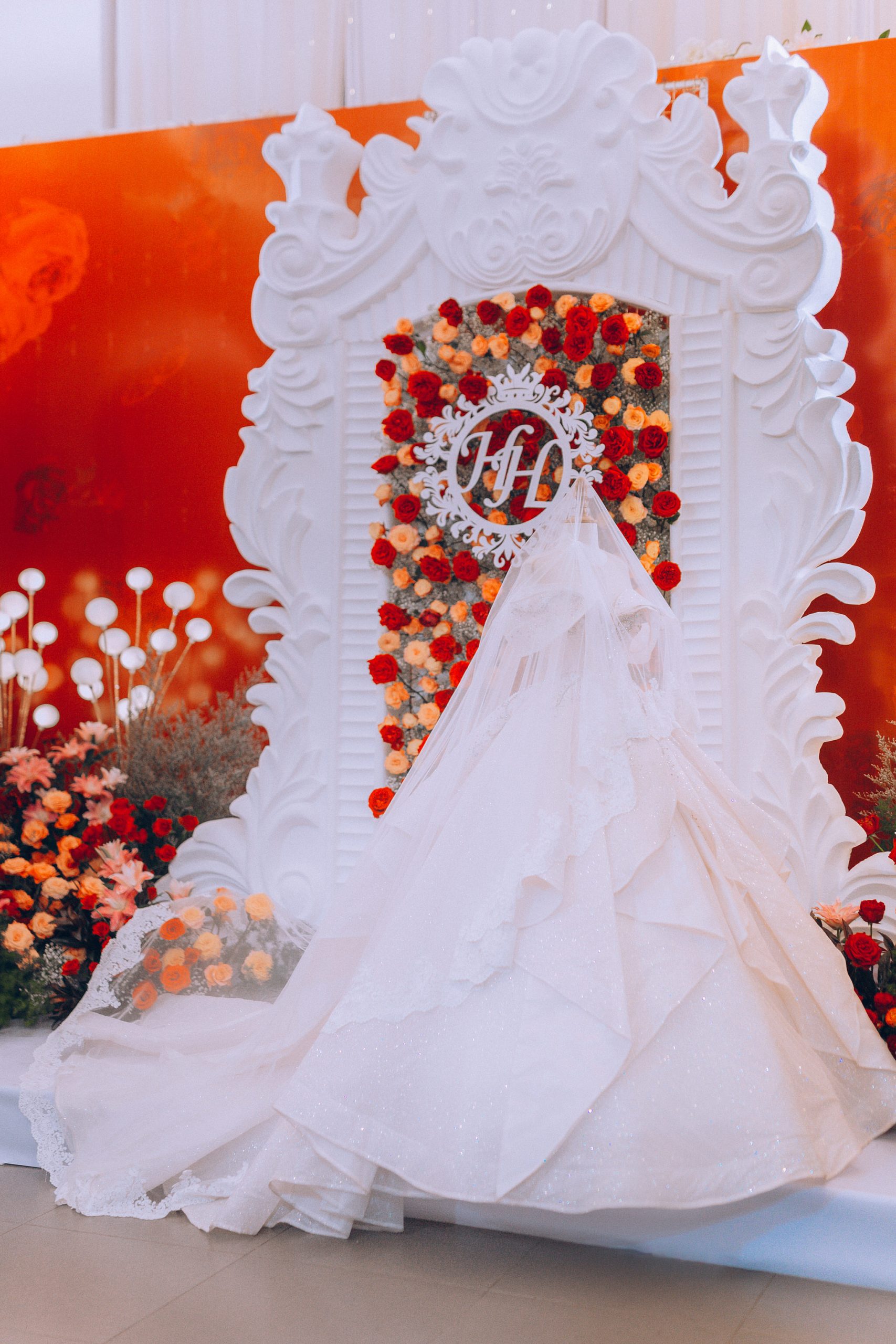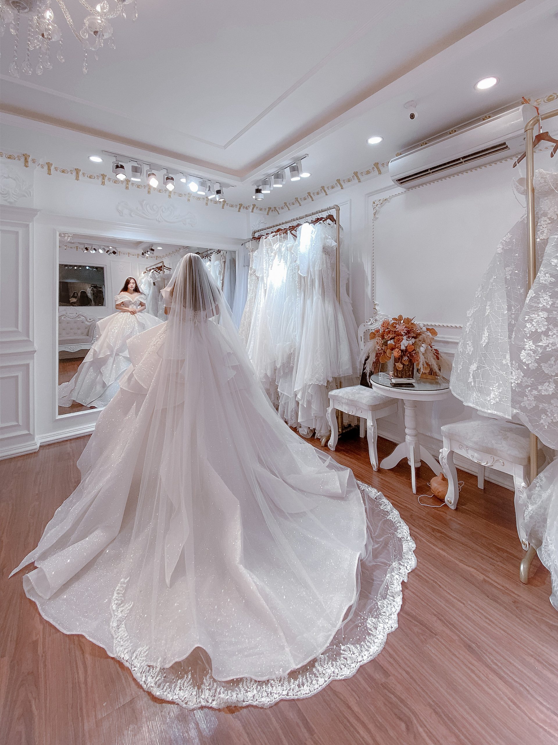 - Lúp Voan (Veil): Một chiếc lúp voan dài quét đất (cathedral veil) được làm từ cùng chất liệu kim tuyến hoặc có viền ren đơn giản sẽ là sự lựa chọn hoàn hảo.