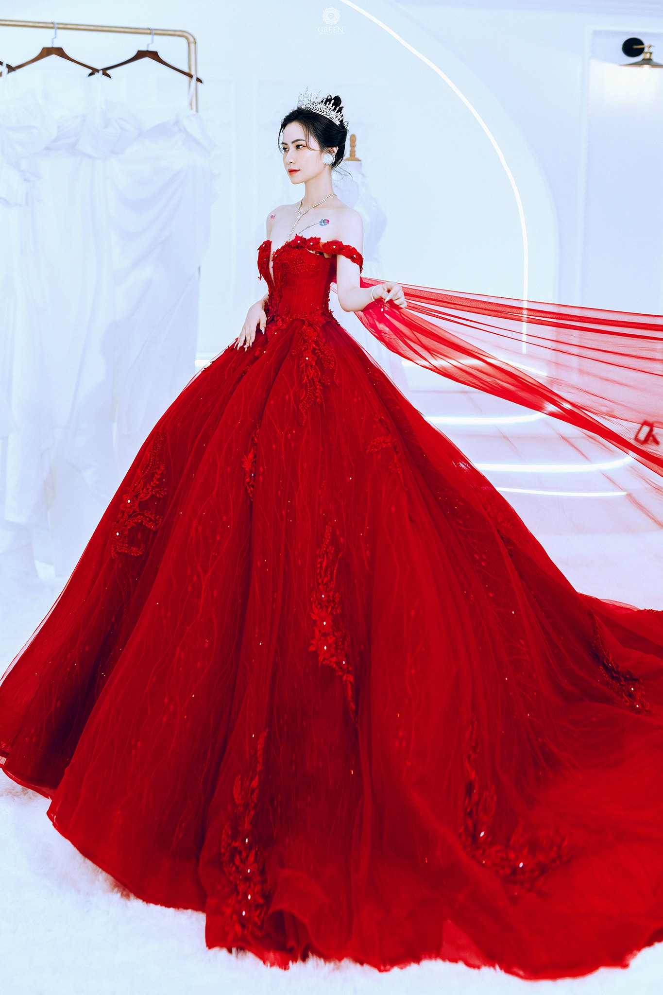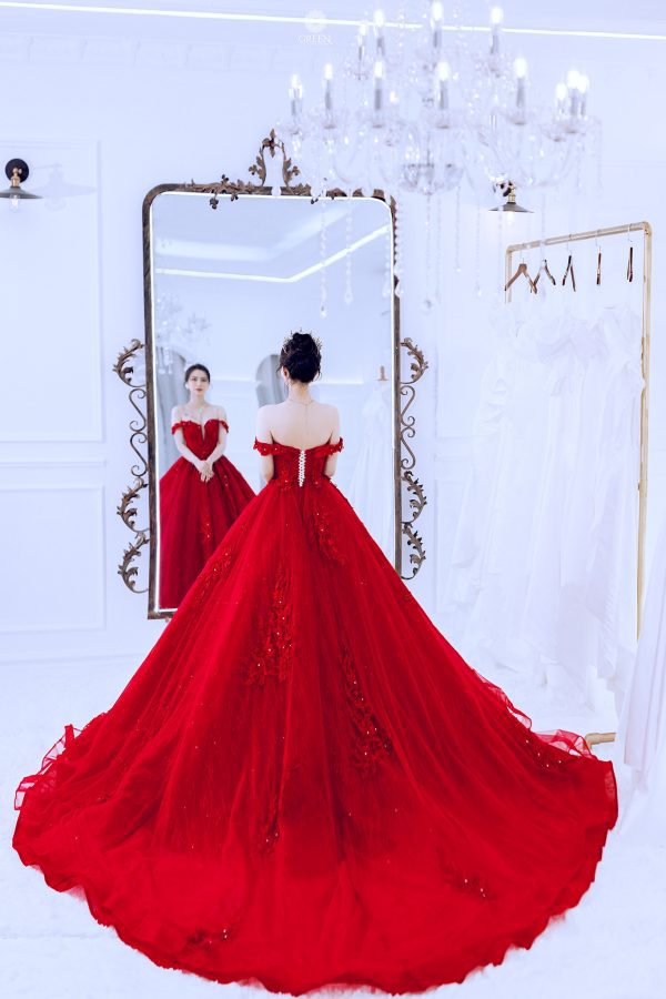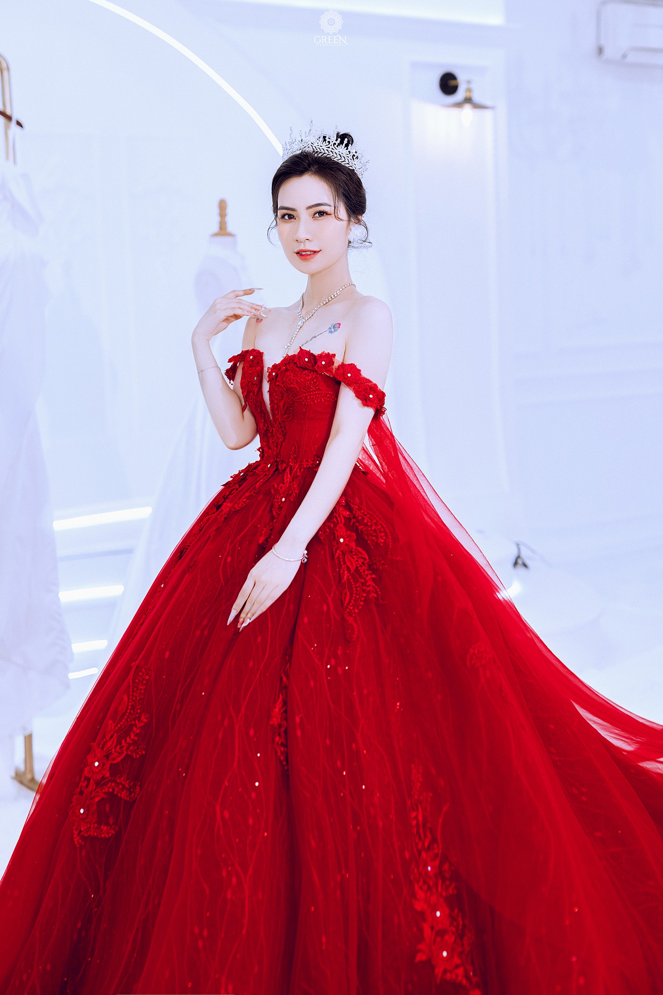 Chiêm ngưỡng kiệt tác váy cưới công chúa màu đỏ "Nữ Hoàng Lửa". Thiết kế trễ vai lộng lẫy, đính kết hoa 3D và đuôi váy hoàng gia. Mẫu váy cưới cao cấp tại Green Studio.