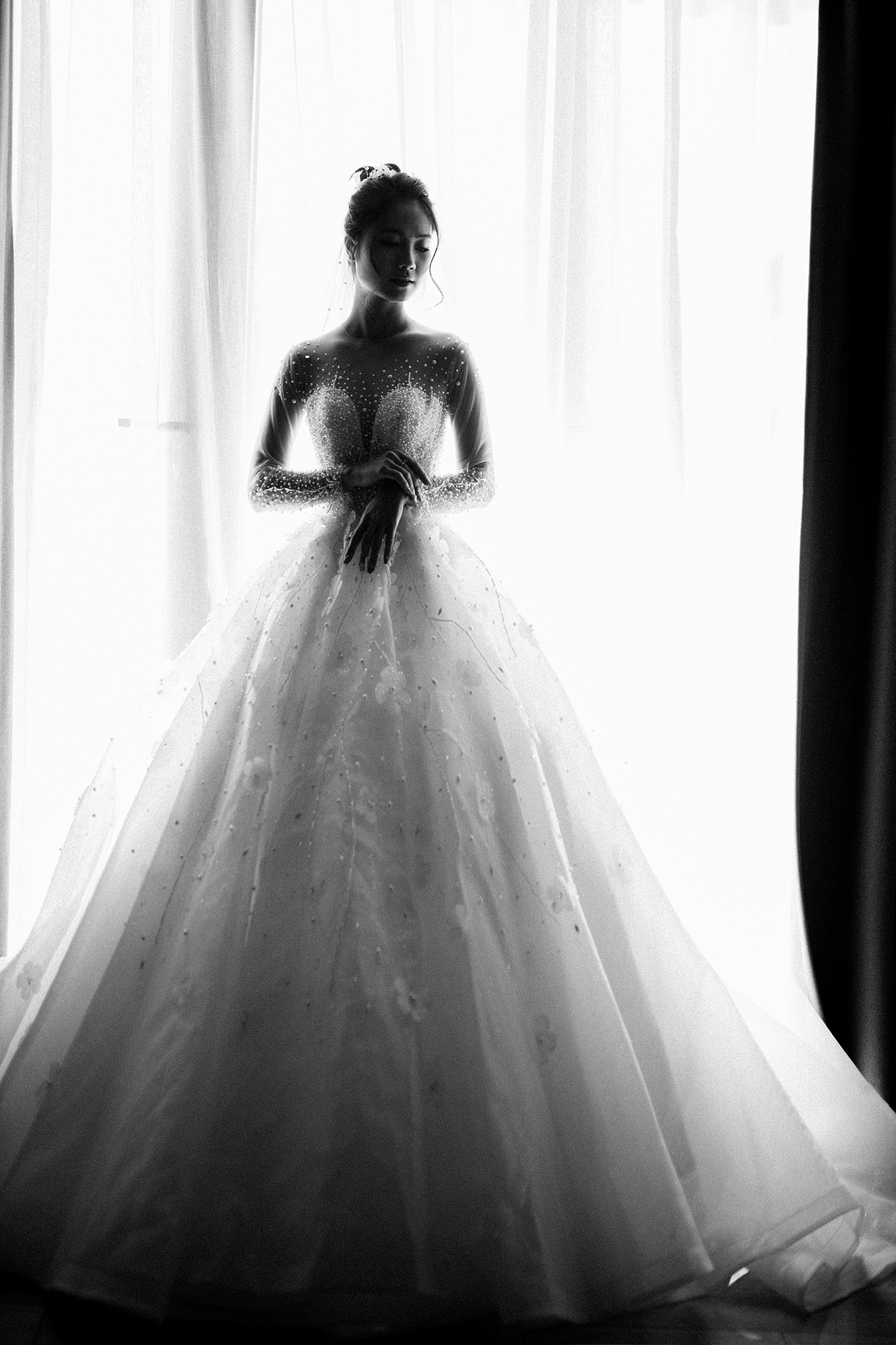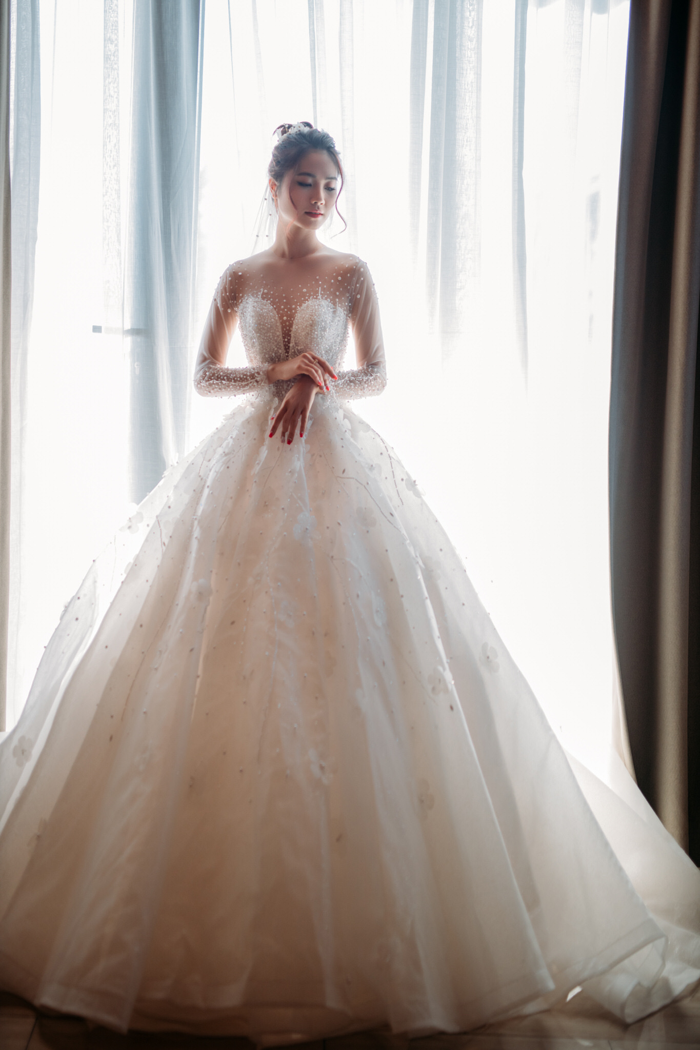 Mẫu váy cưới đính ngọc trai này sở hữu đôi tay áo dài may bằng vải lưới illusion trong suốt, được đính kết họa tiết đồng bộ. Thiết kế này vừa mang lại vẻ đẹp kín đáo, trang trọng, cực kỳ phù hợp cho các buổi lễ tại nhà thờ hay thánh đường, vừa tôn lên nét mềm mại, nữ tính của cô dâu.