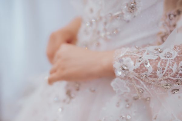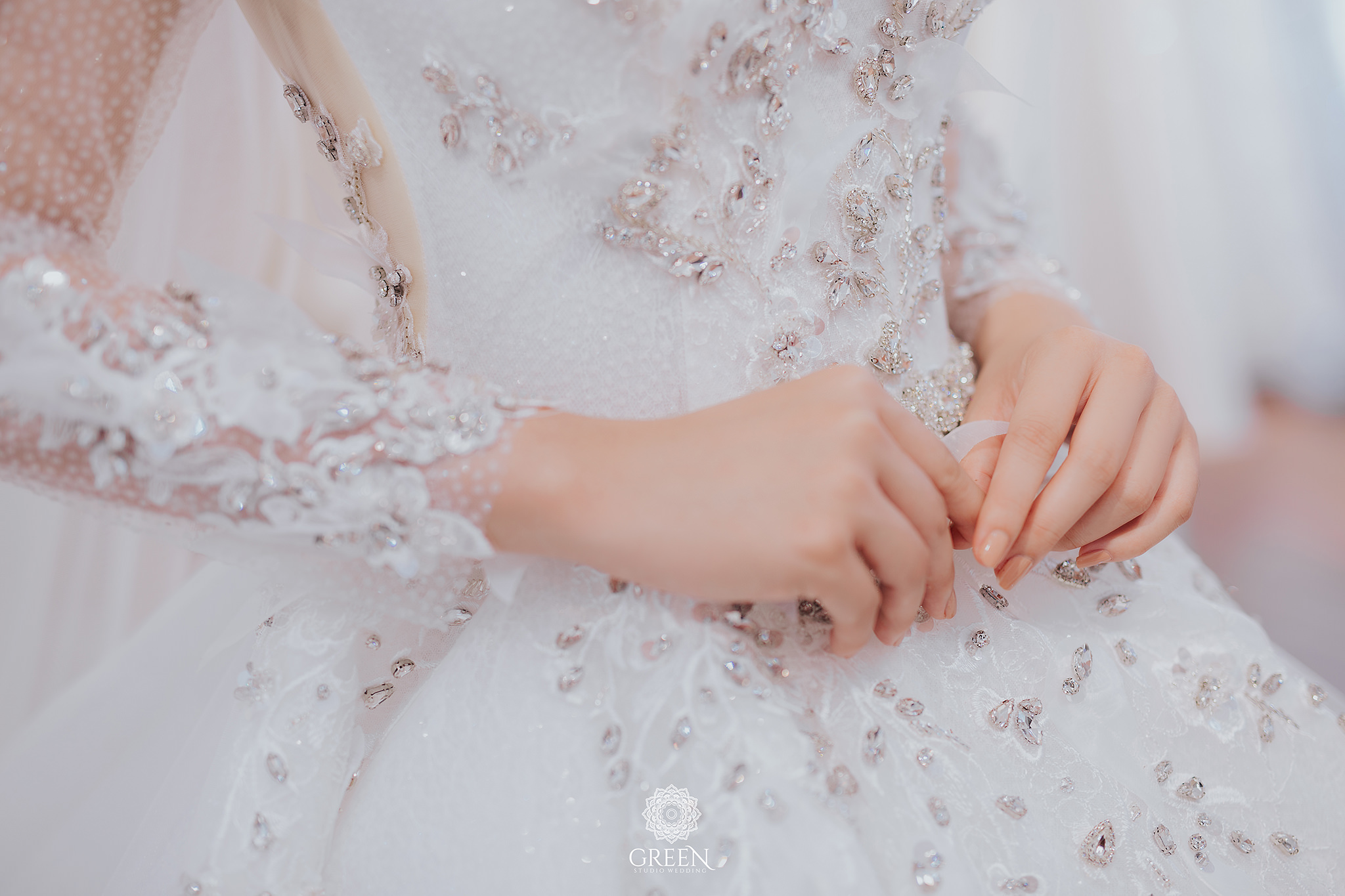Điểm nhấn đắt giá và khác biệt nhất của thiết kế chính là phần tay áo dài xuyên thấu. Trên nền vải voan mỏng manh, hàng ngàn viên pha lê và ngọc trai cao cấp được đính kết thủ công bởi các nghệ nhân của Green, tạo hình như những nhánh cây băng giá. Họa tiết này trải dài từ vai, xuống cánh tay và kết thúc ở cổ tay, tạo nên một “lớp trang sức” nghệ thuật. Phần tay của mẫu váy cưới đính pha lê cao cấp này được giữ xuyên thấu, chỉ đính kết họa tiết ở phần cổ tay, tạo nên sự cân bằng hoàn hảo giữa kín đáo và gợi cảm, giữa sự lộng lẫy và nét thanh thoát.