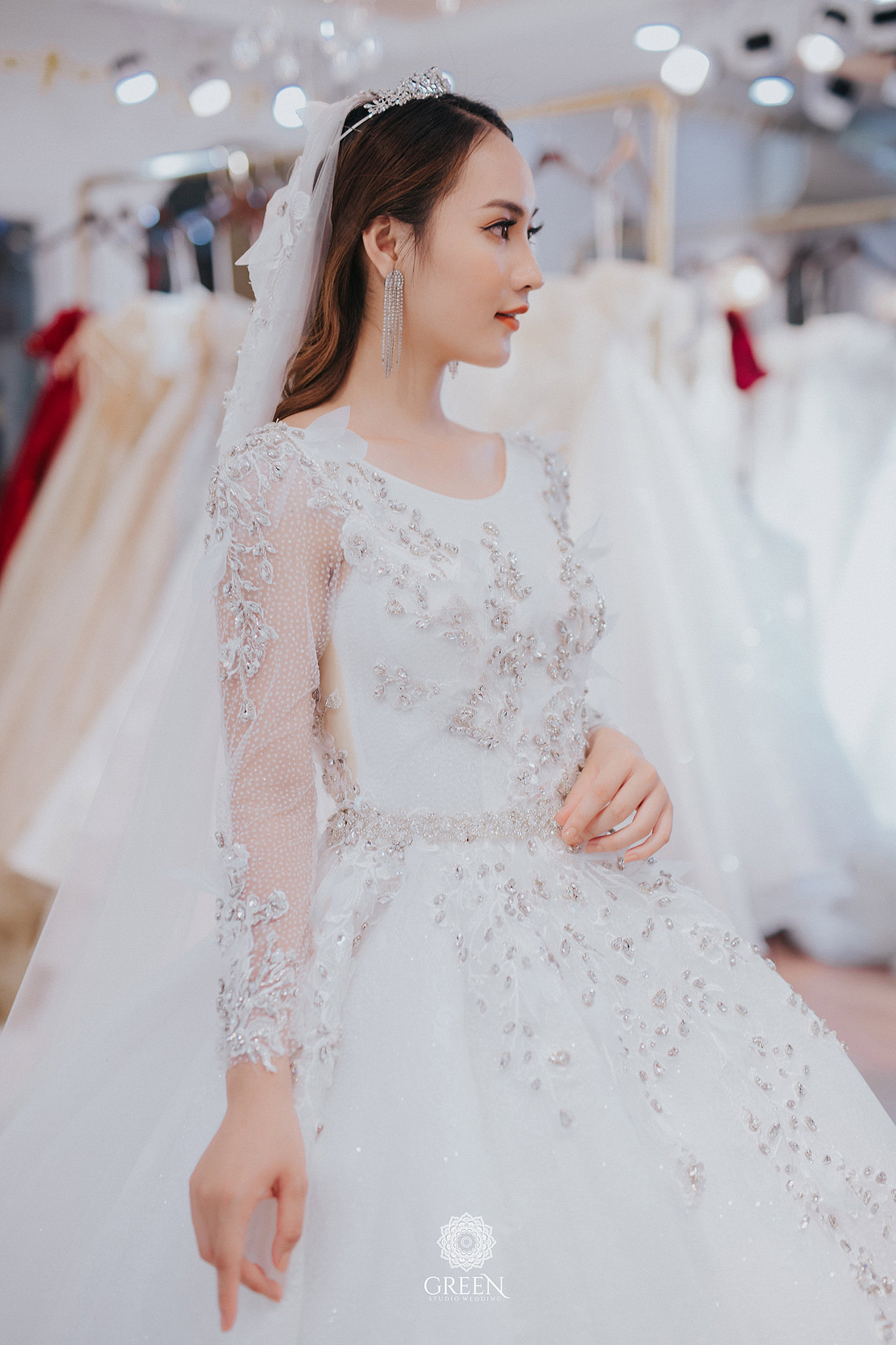 Chiêm ngưỡng kiệt tác váy cưới đính pha lê cao cấp "Nữ Hoàng Băng Giá". Thiết kế công chúa tay dài lộng lẫy, đính kết triệu vì sao. Mẫu váy cưới độc quyền tại Green Studio Vũng Tàu.