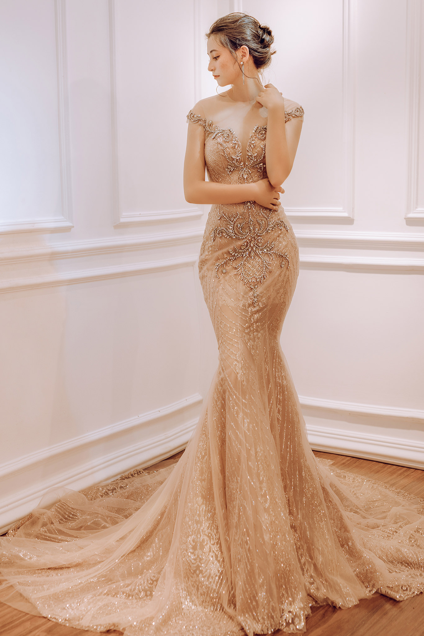 • Chiêm ngưỡng kiệt tác váy cưới đuôi cá màu hồng "Nữ Thần Tình Yêu". Thiết kế trễ vai quyến rũ, đính kết pha lê lộng lẫy. Mẫu váy cưới cao cấp độc quyền tại Green Studio Vũng Tàu.