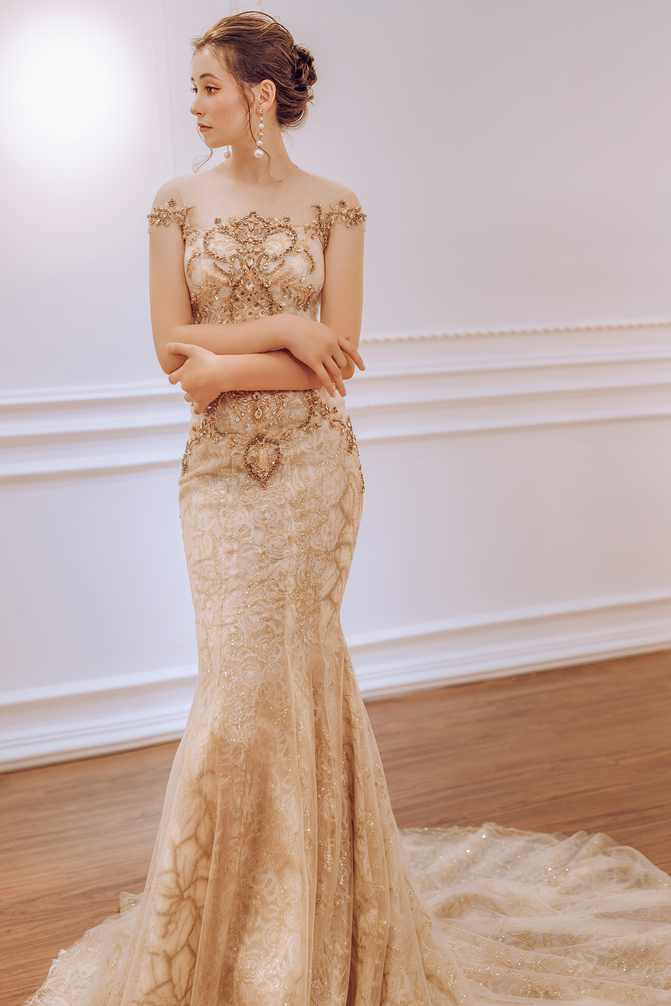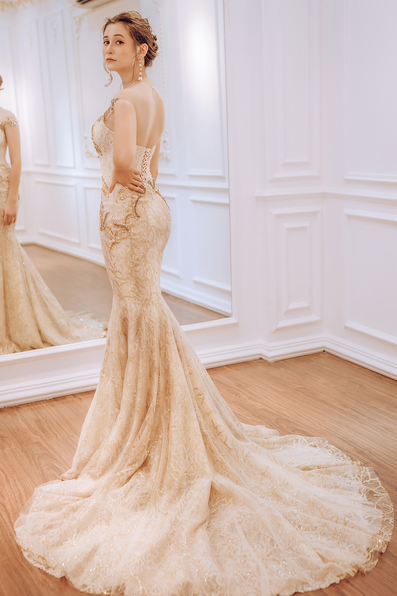• Chiêm ngưỡng kiệt tác váy cưới đuôi cá màu vàng "Nữ Thần Mặt Trời". Thiết kế trễ vai quyến rũ, đính kết vàng gold lộng lẫy và lưng đan dây corset. Mẫu váy cưới cao cấp tại Green Studio Vũng Tàu.