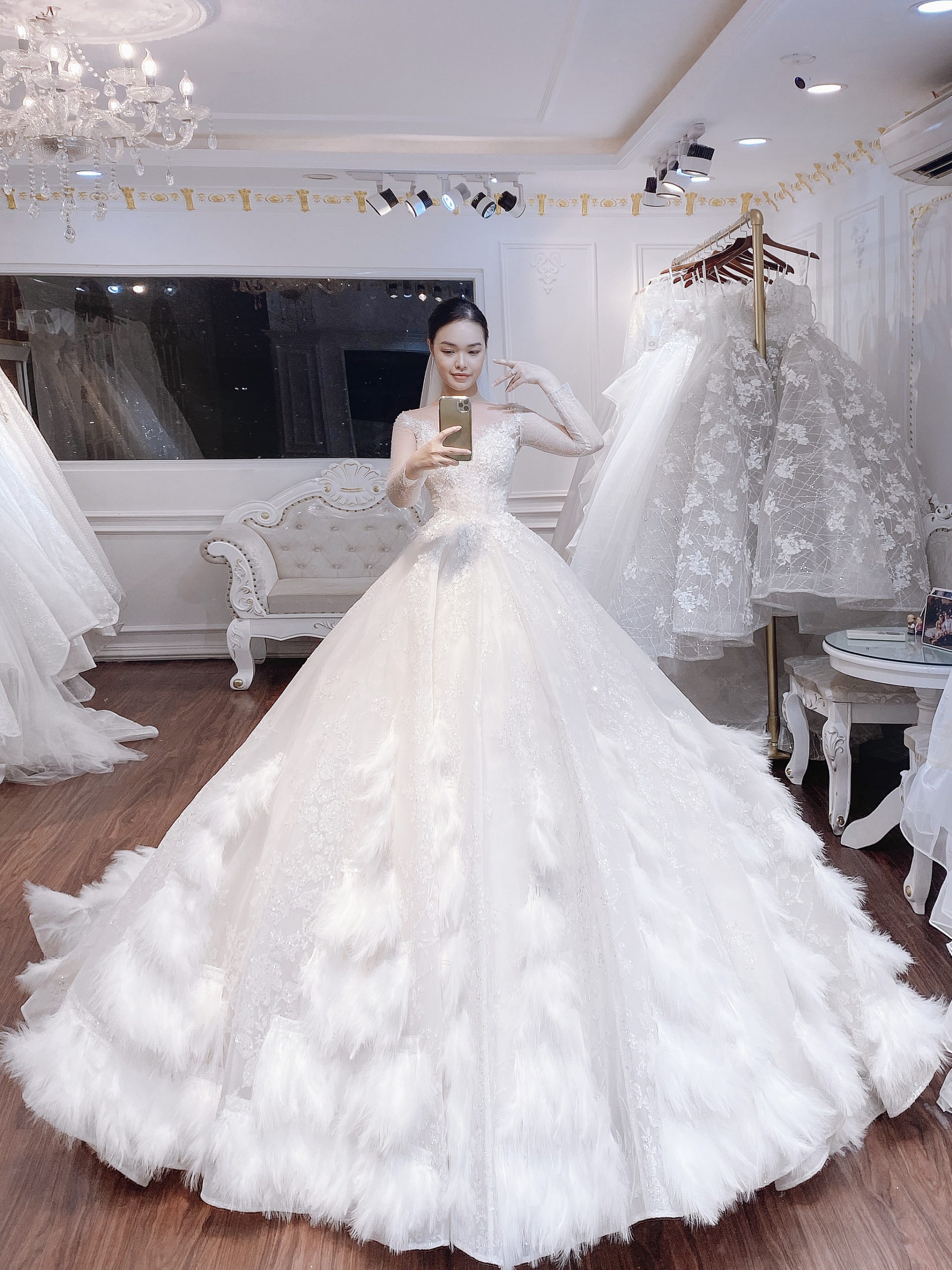 Để hoàn thiện vẻ đẹp cổ tích, kiệt tác váy cưới lông vũ “Thiên Nga Trắng” được xây dựng trên phom dáng váy cưới công chúa (ball gown) kinh điển. Phần eo được siết lại gọn gàng, tương phản với phần chân váy xòe rộng, không chỉ giúp che đi các khuyết điểm mà còn tạo ra một tỷ lệ cơ thể hoàn hảo. Đi kèm với đó là phần đuôi váy dài kiêu hãnh, đảm bảo mỗi bước chân của cô dâu trên lễ đường đều là một khoảnh khắc lịch sử.
