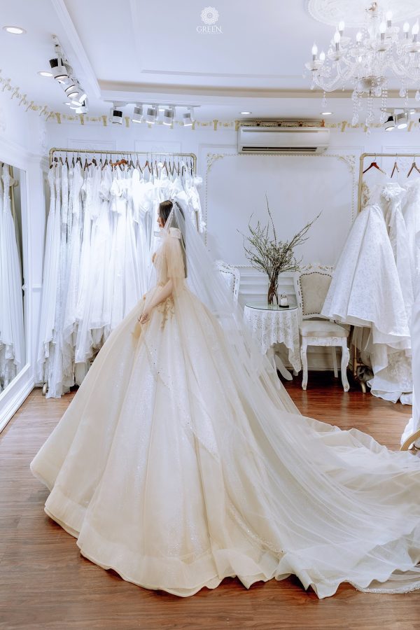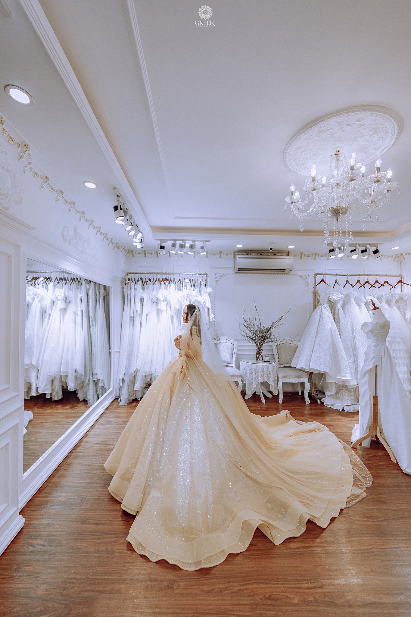 Chiêm ngưỡng kiệt tác váy cưới màu champagne “Nàng Thơ Ánh Dương”. Thiết kế công chúa lộng lẫy với tay cánh tiên và chân váy kim tuyến triệu vì sao. Mẫu váy cưới cao cấp tại Green Studio.
