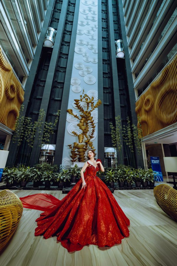 Mỗi thiết kế đều có một câu chuyện, và câu chuyện của chiếc váy cưới màu đỏ “Nữ Hoàng Quyền Lực” bắt nguồn từ vẻ đẹp rực rỡ của một viên ruby hoàng gia. Màu đỏ, trong cả văn hóa phương Đông và phương Tây, luôn là gam màu của quyền lực, của đam mê và may mắn. Lấy cảm hứng từ sắc độ sâu thẳm đó, các nhà thiết kế của Green đã tạo nên một tông màu đỏ độc quyền, vừa đủ độ trầm để giữ được sự sang trọng, vừa đủ độ tươi để nổi bật dưới mọi ánh đèn.