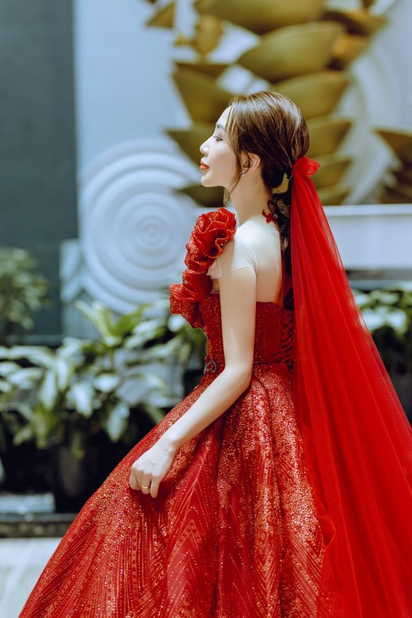 Đây không chỉ là trang phục cho ngày cưới, mà là một tác phẩm nghệ thuật tôn vinh sự tự tin và đam mê. Mẫu váy cưới màu đỏ này sẽ biến lễ đường thành sàn diễn của riêng bạn.
