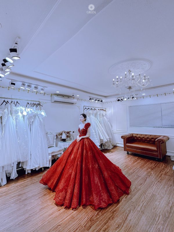 Dám khác biệt với mẫu váy cưới màu đỏ "Nữ Hoàng Quyền Lực" từ Green Studio. Thiết kế công chúa lộng lẫy, vai lệch độc đáo và chân váy kim tuyến rực rỡ. Khám phá ngay tại Vũng Tàu!