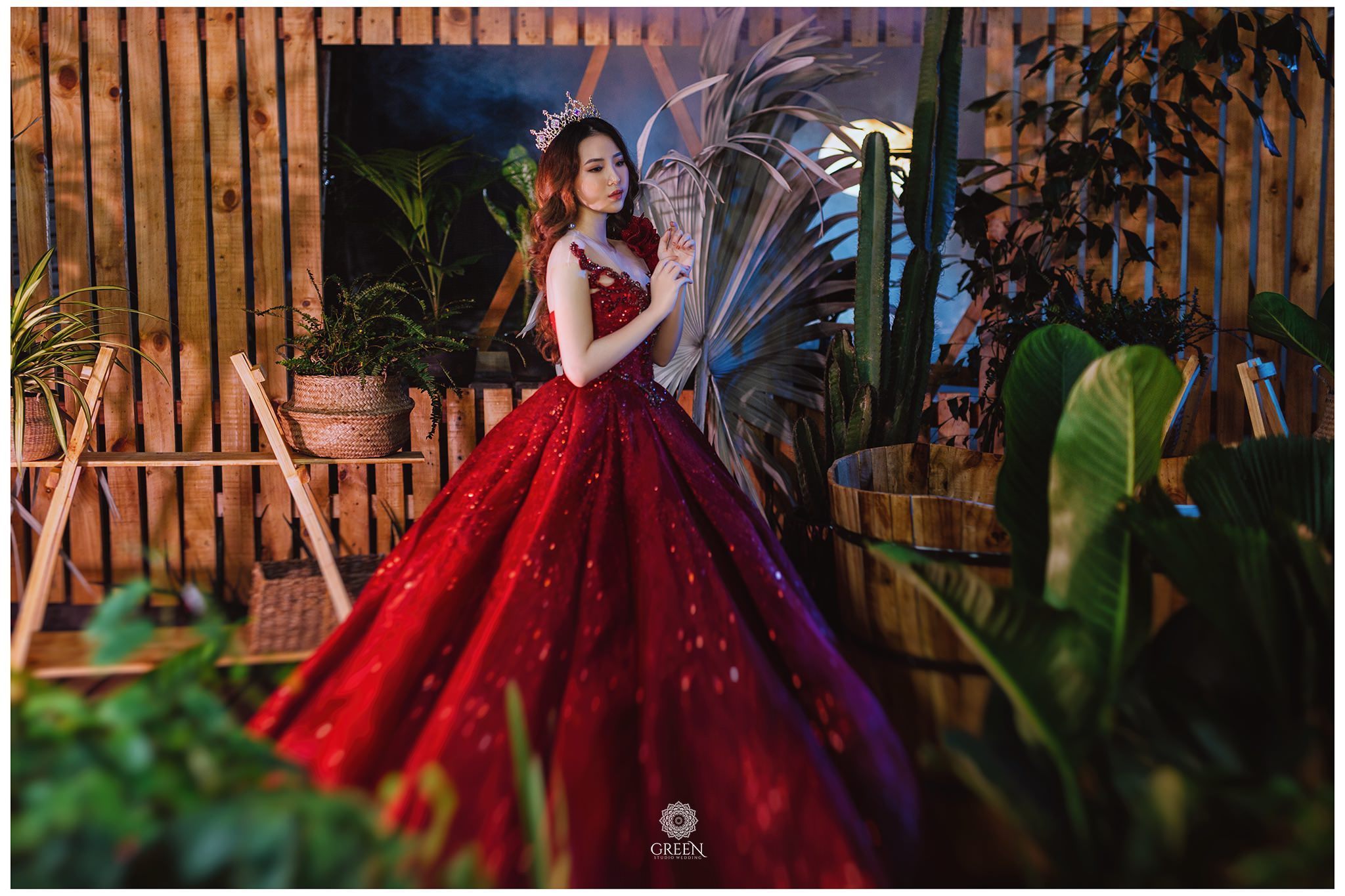 Trong thế giới váy cưới, màu trắng luôn ngự trị như một biểu tượng của sự tinh khôi. Nhưng đối với những nàng dâu hiện đại, cá tính và không ngại trở thành tâm điểm, một chiếc váy cưới màu đỏ chính là tuyên ngôn mạnh mẽ nhất về tình yêu nồng cháy và phong cách hoàng gia. Nắm bắt tinh thần đó, Green Studio Wedding tự hào giới thiệu kiệt tác độc đáo mang tên “Nữ Hoàng Quyền Lực” – một thiết kế sinh ra để dành cho những người phụ nữ dám khác biệt.