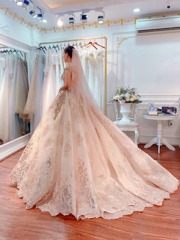 Sắc hồng champagne hoàng tộc được lựa chọn vì nó mang lại cảm giác sang trọng, cổ điển nhưng không quá phô trương. Đây là một chiếc váy cưới màu hồng đính kết dành cho những người phụ nữ yêu thích vẻ đẹp vượt thời gian.