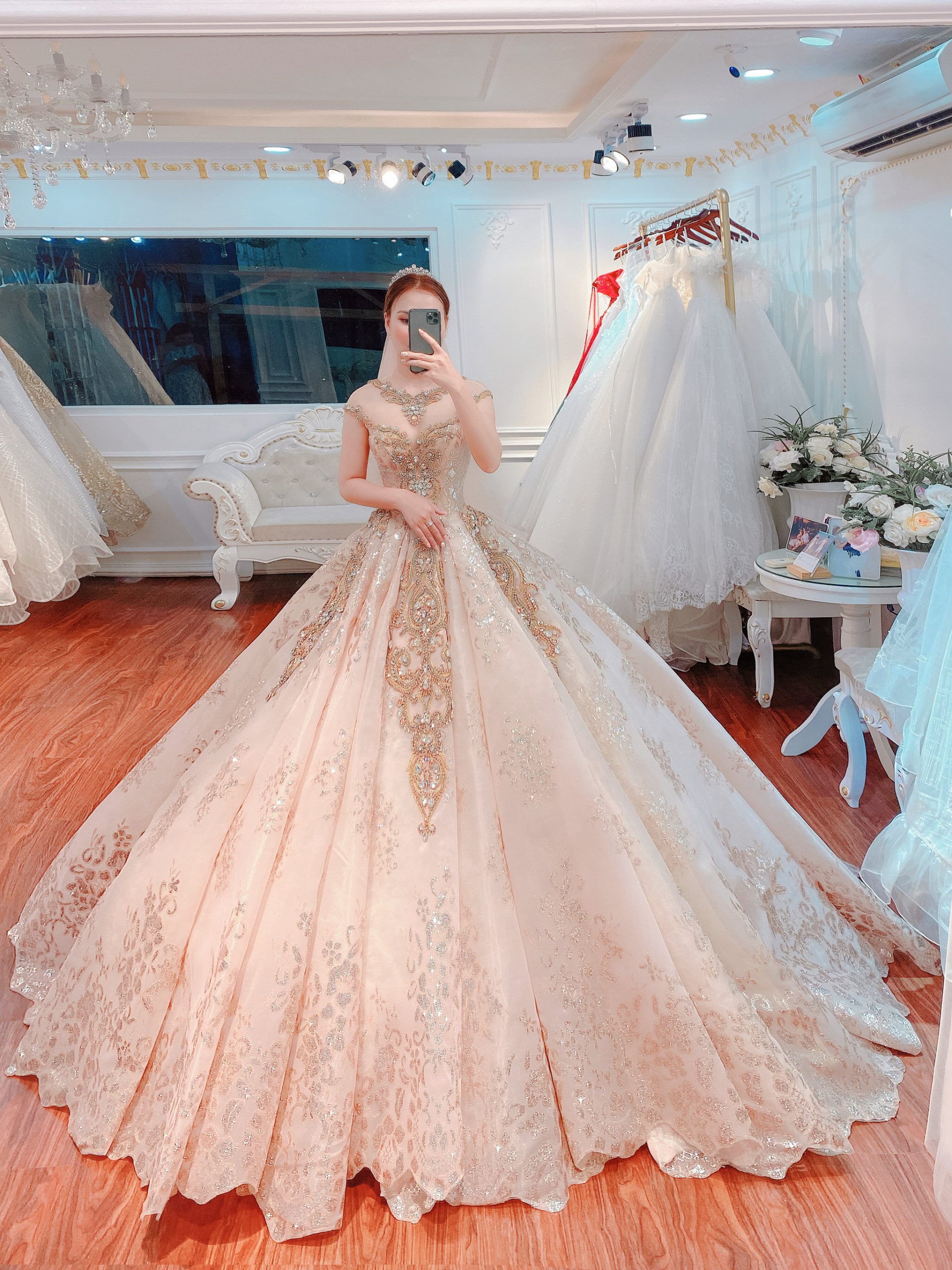 Chiêm ngưỡng kiệt tác váy cưới màu hồng đính kết "Nữ Hoàng Versailles". Thiết kế công chúa hoàng gia, thêu vàng gold và lấp lánh triệu vì sao. Mẫu váy cưới cao cấp tại Green Studio Vũng Tàu.