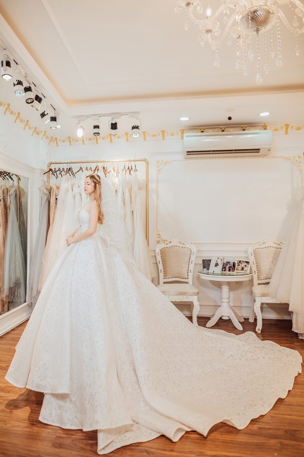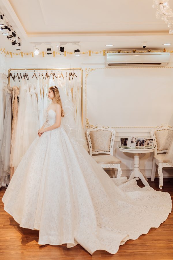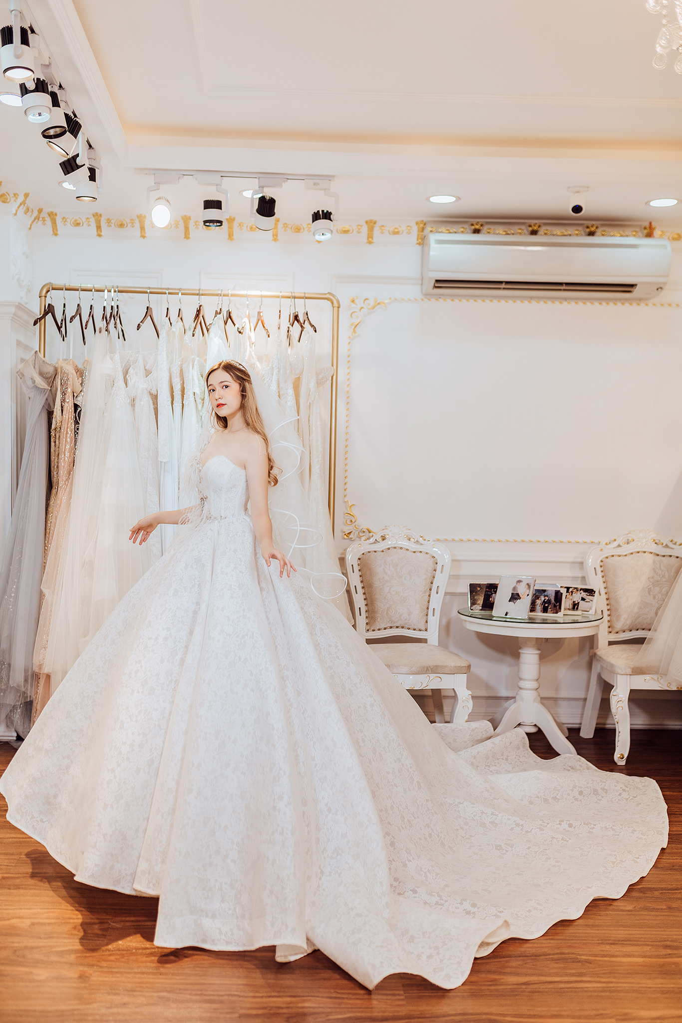 Toàn bộ chiếc váy được may từ chất liệu ren hoàng gia cao cấp, được dệt xen kẽ với những sợi kim tuyến li ti, tạo hiệu ứng lấp lánh tinh tế mỗi khi cô dâu di chuyển. Dáng váy công chúa xòe bồng bềnh cùng phần đuôi váy dài quét đất mang lại vẻ uy nghi, hoành tráng. Đây là đỉnh cao của một chiếc váy cưới ren cao cấp lộng lẫy.