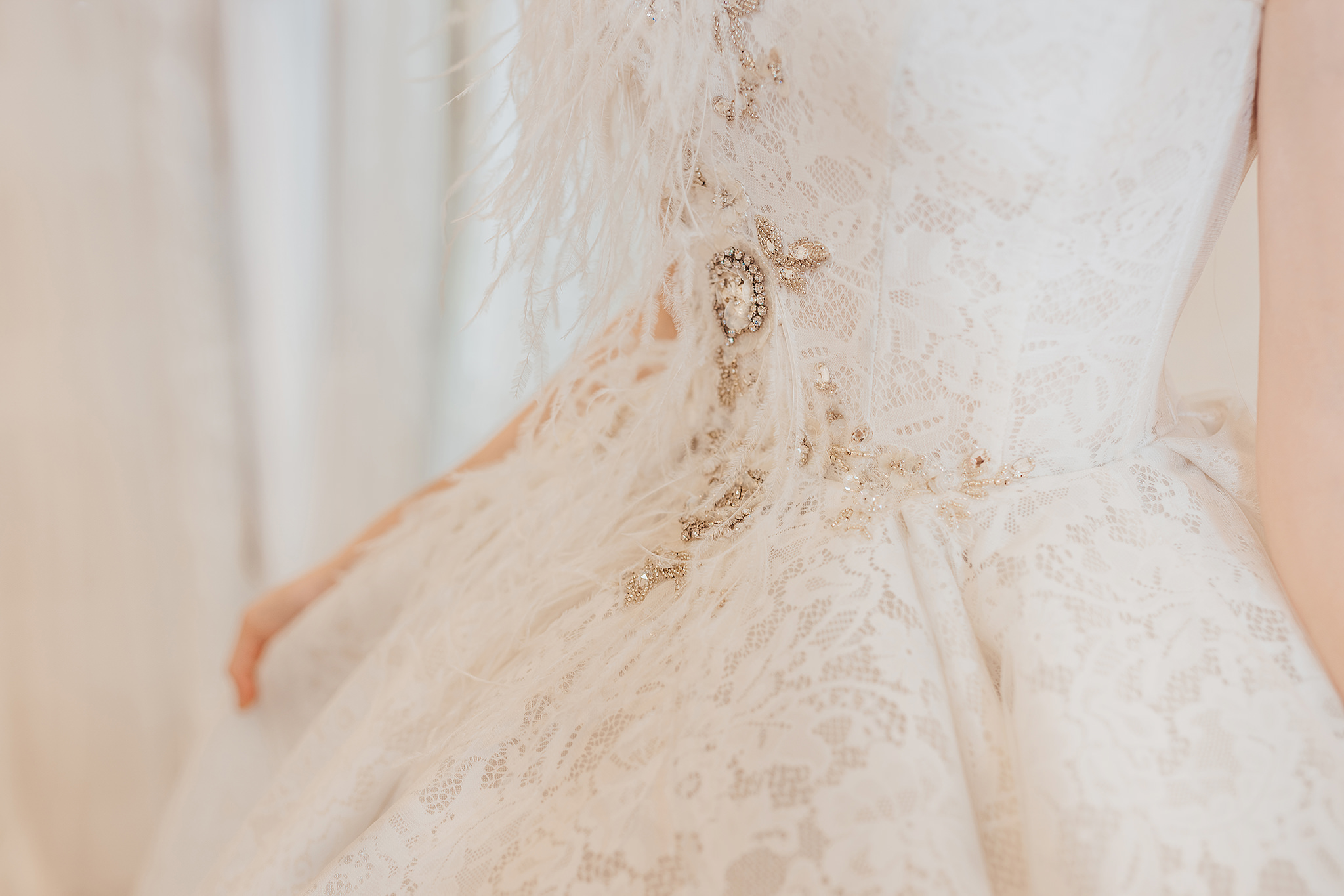 Điểm nhấn đắt giá và khác biệt nhất của thiết kế chính là phần thân áo cúp ngực được cách điệu đầy nghệ thuật. Trên nền corset vững chắc, các nghệ nhân của Green đã đính kết những họa tiết ren hoa 3D và điểm xuyết những sợi lông vũ mềm mại, tạo nên một chi tiết vừa kín đáo, vừa phá cách. Chi tiết này không chỉ thể hiện gu thẩm mỹ tinh tế mà còn giúp chiếc váy cưới ren cao cấp này trở nên độc nhất.