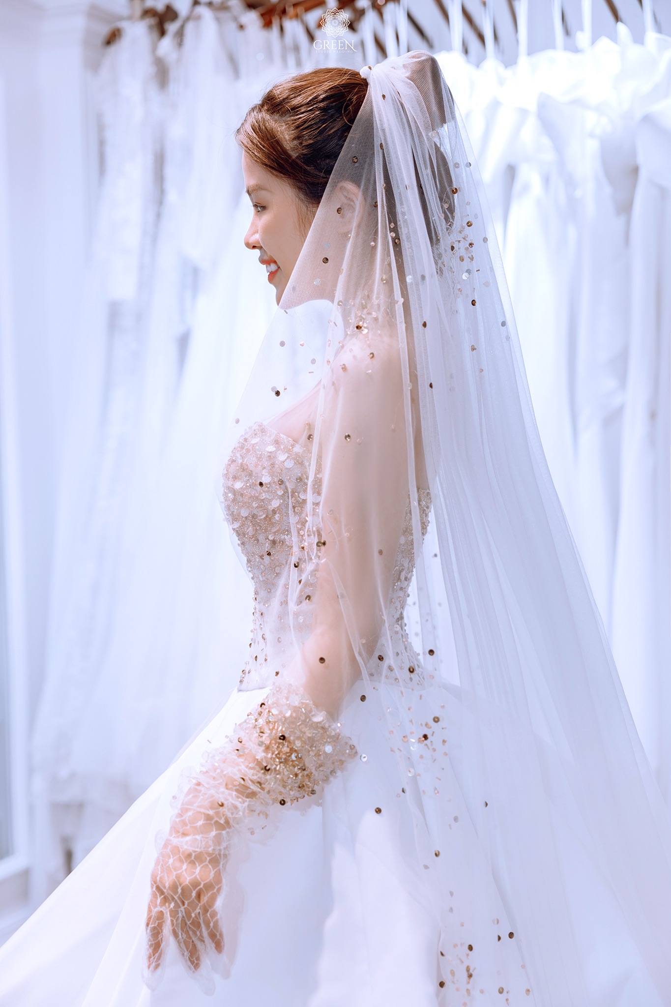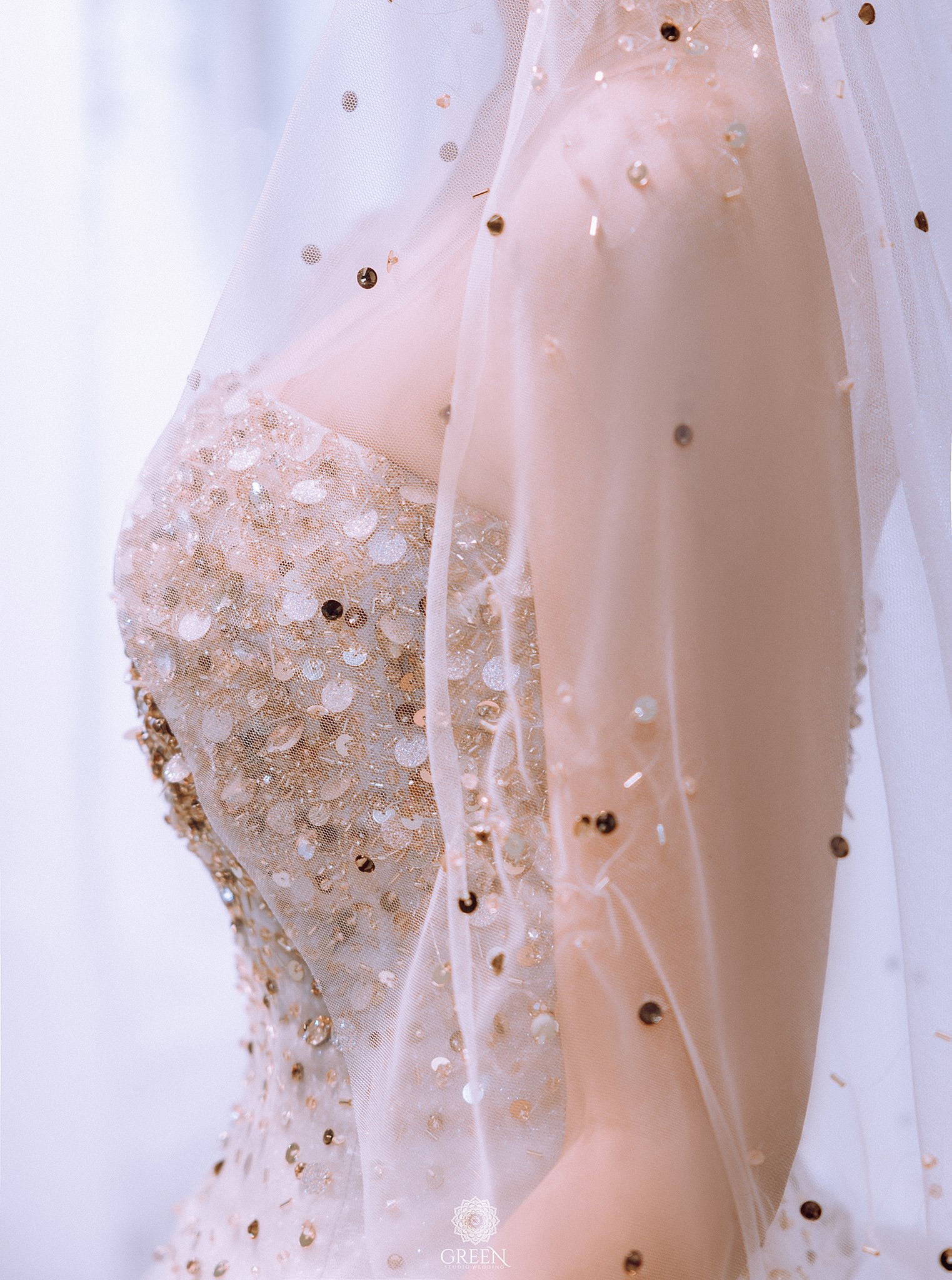 Để hoàn thiện vẻ đẹp hoàng gia, bộ trang phục còn đi kèm với những phụ kiện được thiết kế riêng. Đôi găng tay dài xuyên thấu được đính kết họa tiết sequin đồng bộ với thân áo, mang lại vẻ cổ điển và quý phái. Chiếc lúp voan dài được điểm xuyết những hạt sequin lấp lánh, tạo nên một tổng thể hài hòa và hoàn hảo đến từng chi tiết cho mẫu váy cưới satin công chúa này.