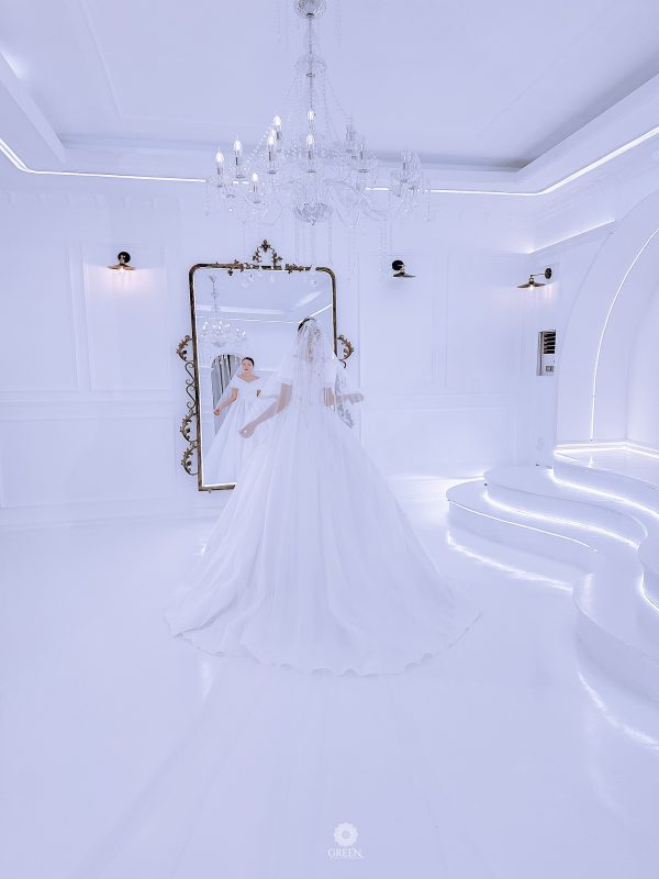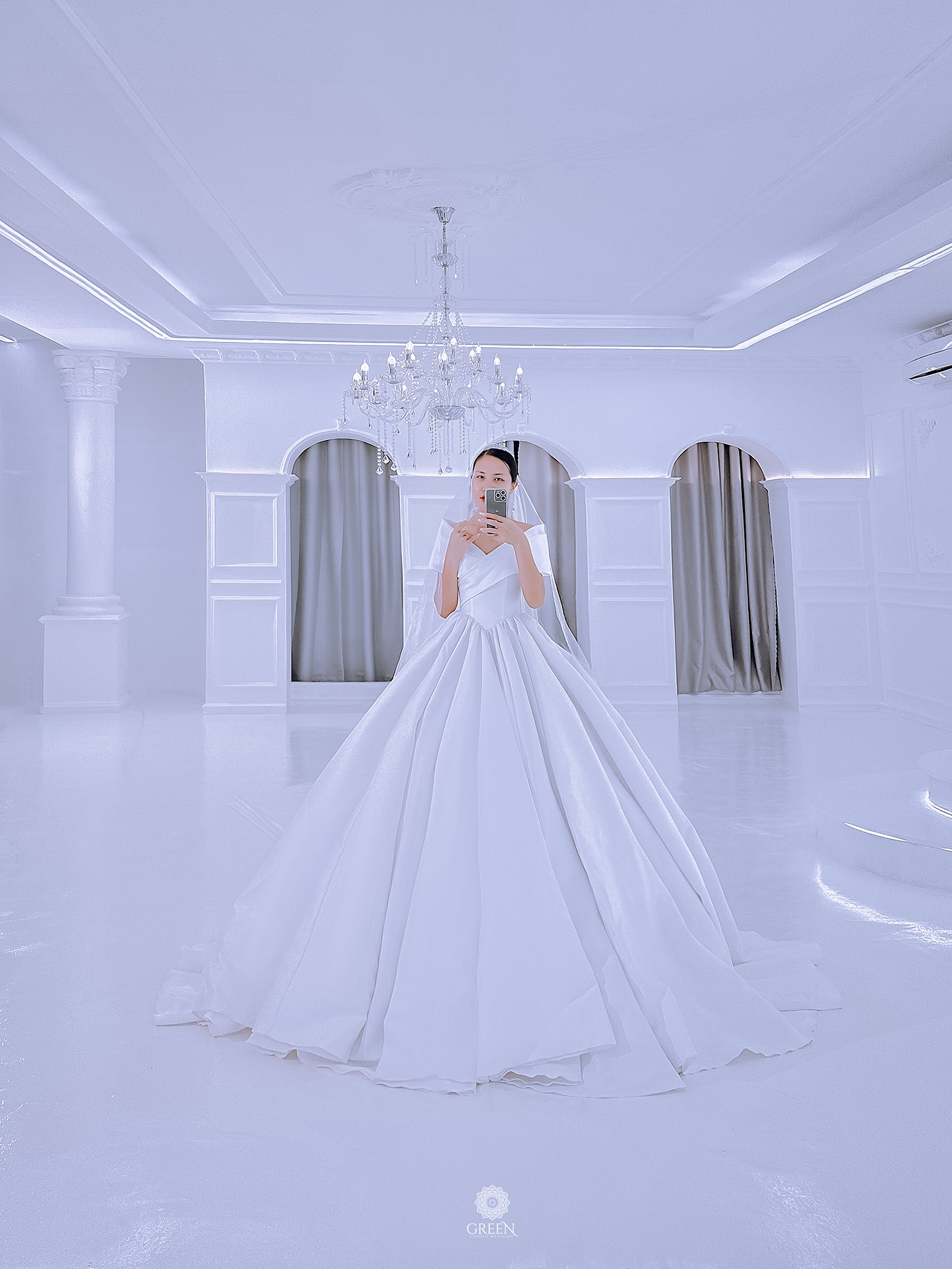 Chiêm ngưỡng kiệt tác váy cưới satin trễ vai “Nữ Thần Tối Giản”. Thiết kế công chúa tối giản, sang trọng với chất liệu satin hoàng gia. Mẫu váy cưới cao cấp tại Green Studio Vũng Tàu.