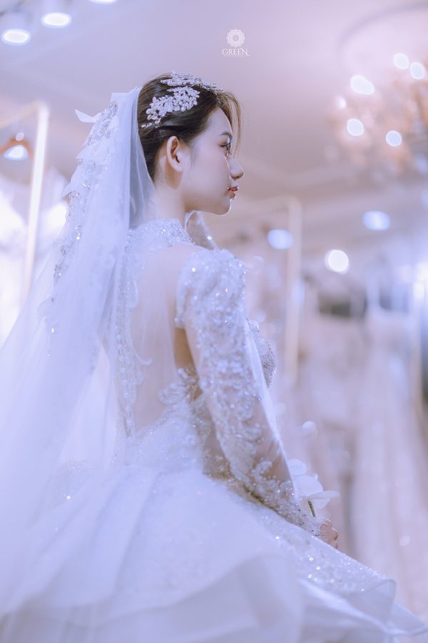 [Gợi ý chèn hình ảnh 4O0A7515.PNG ở đây] [Văn bản thay thế (Alt Text): Cô dâu mặc váy cưới tay dài lấp lánh Nữ Hoàng Ngân Hà của Green Studio]
