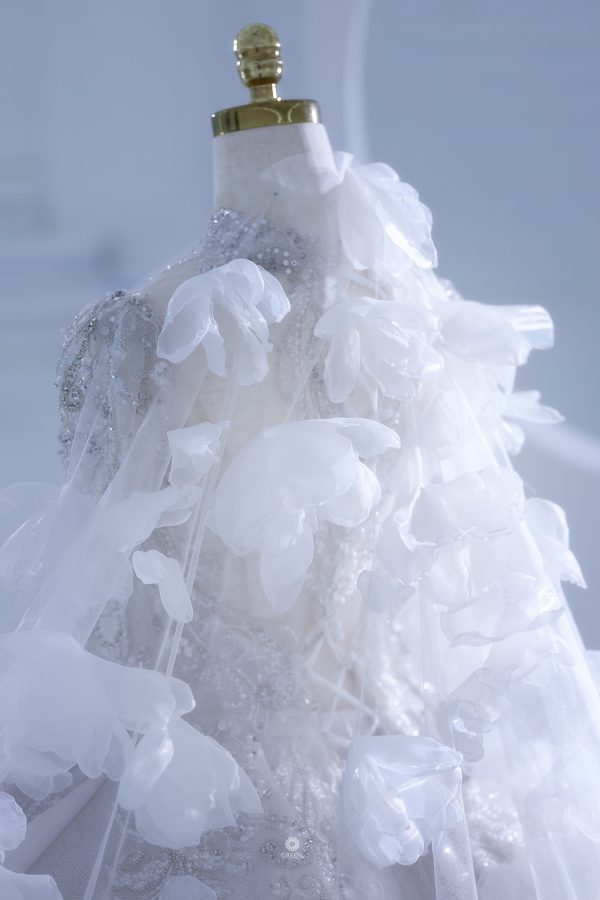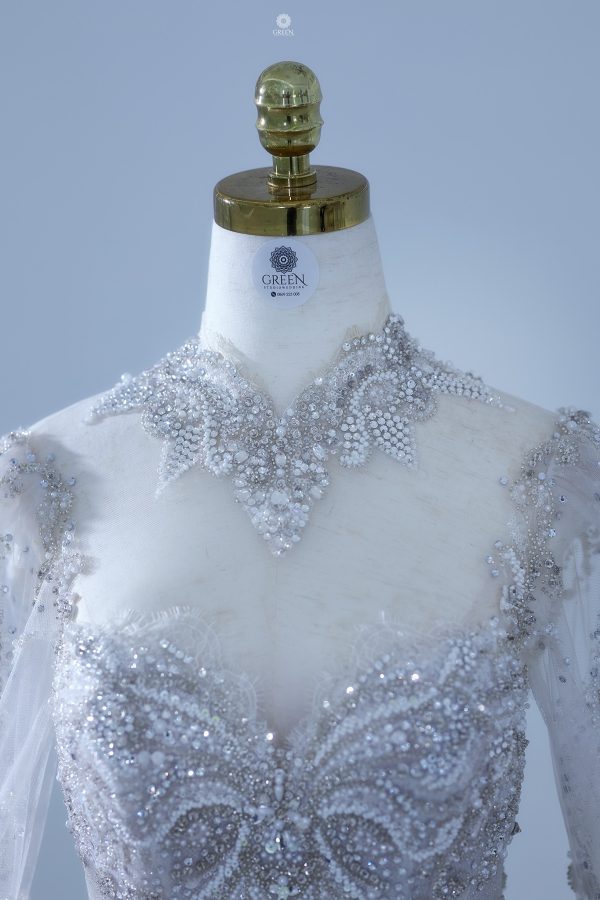 Điểm nhấn đắt giá và khác biệt nhất của thiết kế chính là phần cổ cao và tay áo. Được chế tác trên nền vải voan xuyên thấu màu da, phần cổ áo được đính kết thủ công bởi hàng ngàn viên pha lê và ngọc trai cao cấp, tạo hình như một chiếc vòng cổ hoàng gia quyền lực. Họa tiết này trải dài từ cổ, xuống cầu vai và nối liền với phần tay áo. Phần tay của mẫu váy cưới tay dài lấp lánh này được giữ xuyên thấu, chỉ đính kết họa tiết ở phần cổ tay, tạo nên sự cân bằng hoàn hảo giữa kín đáo và gợi cảm, giữa sự lộng lẫy và nét thanh thoát.